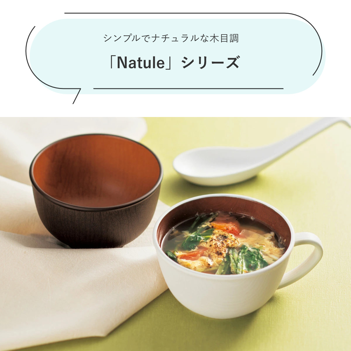 器の外側と内側には木目調のデザインが施されています。食卓に馴染みやすく、温かい雰囲気に包まれるような、ぬくもりを感じられるデザインです。