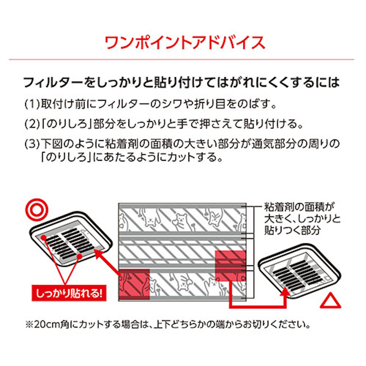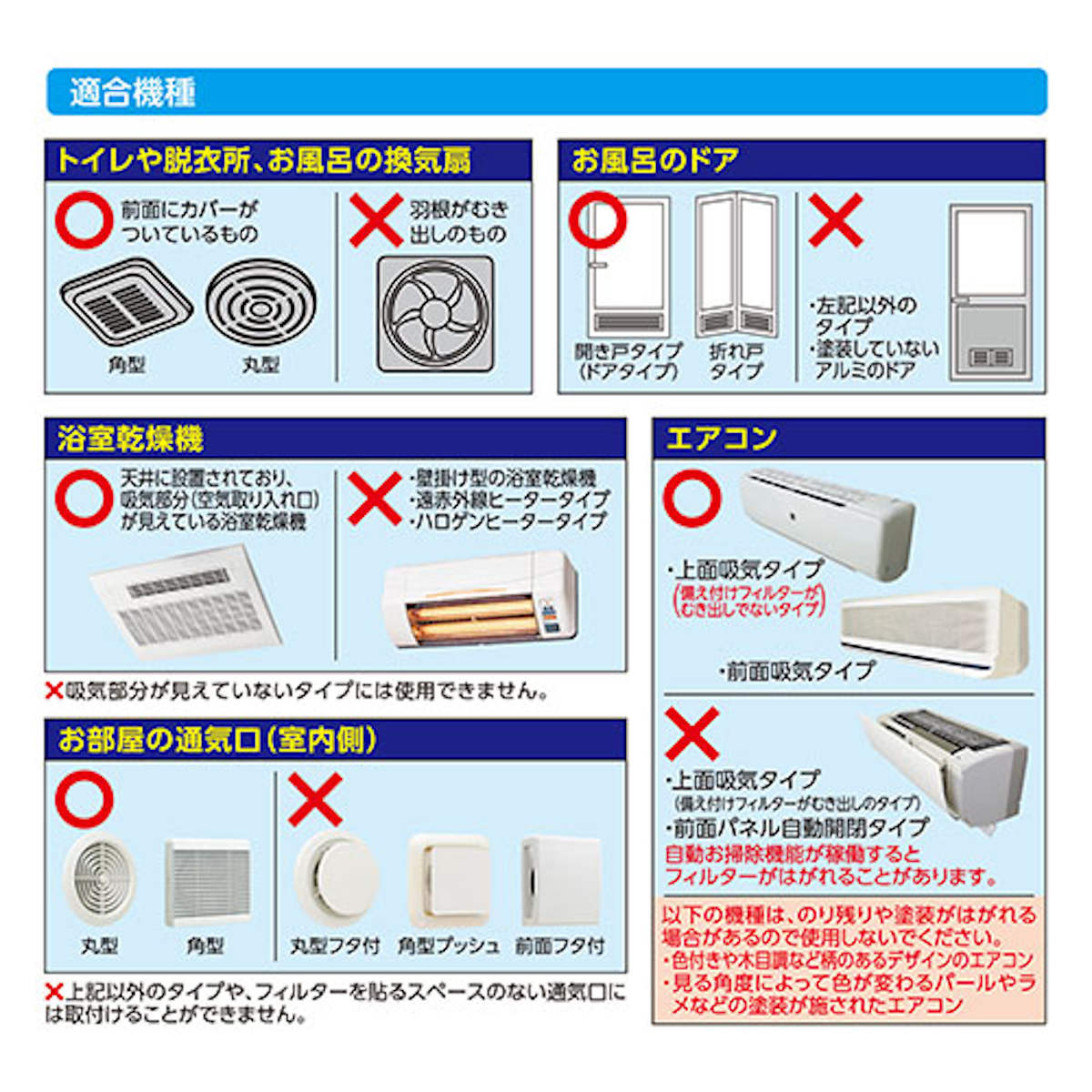トイレ・脱衣所・お風呂の換気扇、お部屋の通気口、お風呂のドア、エアコン、浴室乾燥機と様々な場所でご使用いただけます。細かな繊維を密にしながらも空気はしっかり通る設計なので、家電の性能を損ないにくく様々な用途で活躍します。