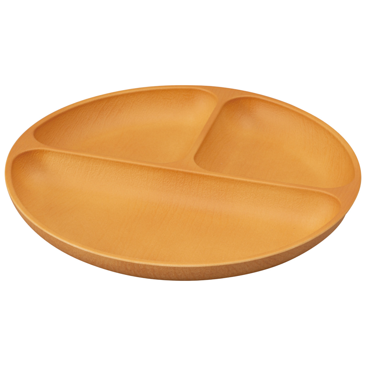樹脂製で軽くて割れにくい耐久性のあるプレートです。ナチュラルな木目調が魅力で、普段使いにぴったりです。ごはんとおかずの盛り付けに便利な3つの仕切り付きプレートです。