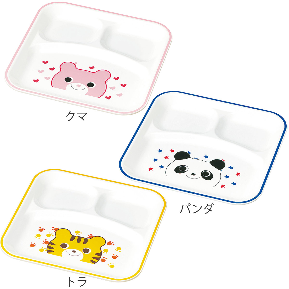 軽くて割れにくく、小さなお子さまも安心して使える樹脂製のスクエアランチプレートです。かわいい動物たちのデザインが、毎日の食事タイムを楽しく応援。3つの仕切りがあるため、ごはんとメイン・副菜を分けて盛り付けられます。少量ずつ盛れるので、バランスの良いお子さまランチ作りにぴったりです。