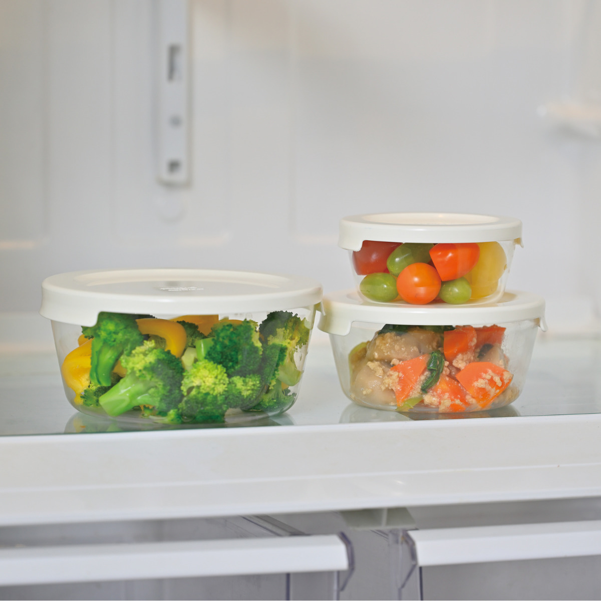 ●色と匂いがつきにくい耐熱ガラス製丸型コンテナ3個入りです。