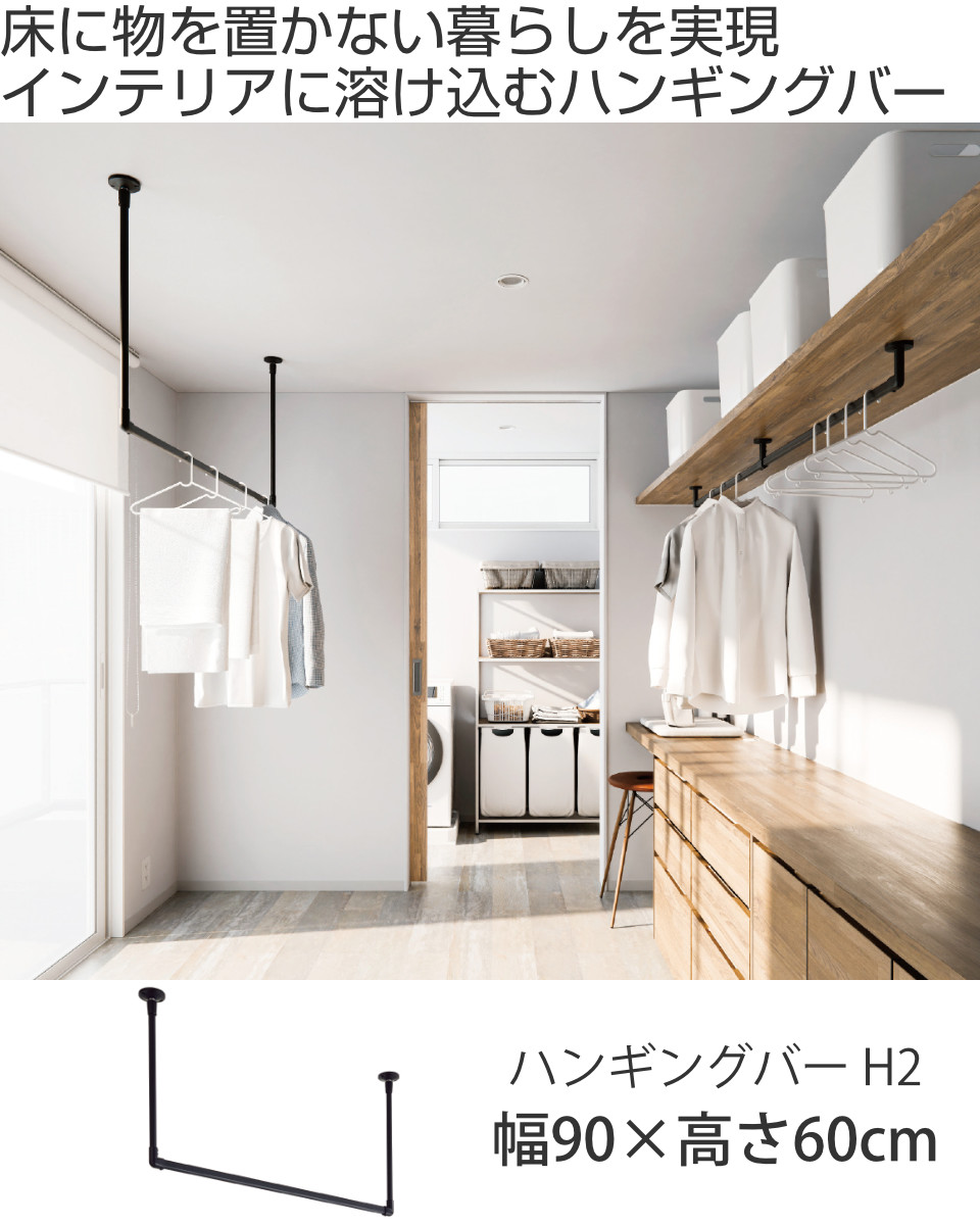 モノトーンのハンギングバーは、マットな質感に仕上げられているためインテリア性が高く、ランドリーやリビング、ウォークインクローゼットなどへも設置できます。洗濯物を干す用途だけでなく、収納スペースの確保やディスプレイバーとしての使用もお勧めです。