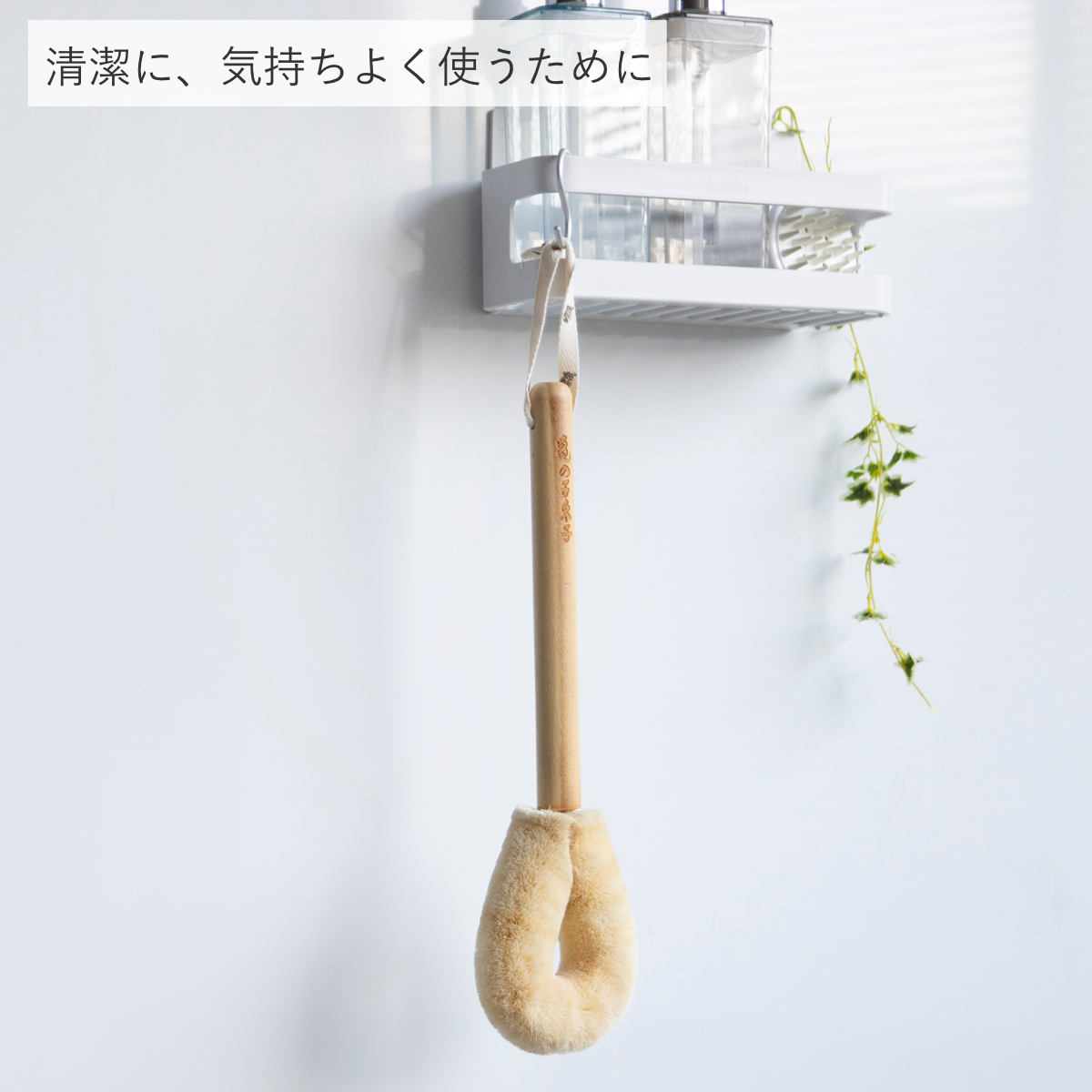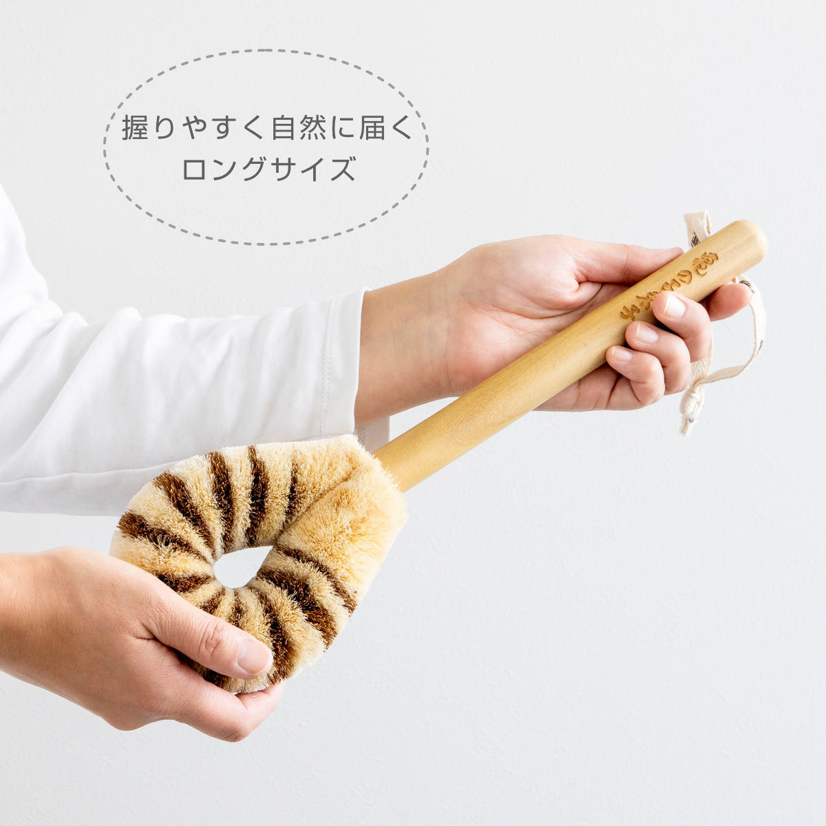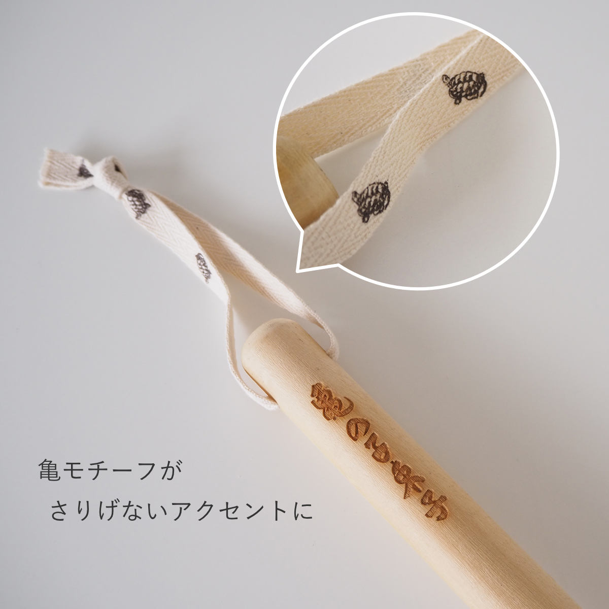 柄付きタイプは使いやすさだけでなくデザインにもこだわりました。ひも部分にはさりげなく亀のモチーフをあしらい、柄には「亀の子束子」のロゴ入り。吊るしておくだけでも、バスルームのちょっとしたアクセントになります。