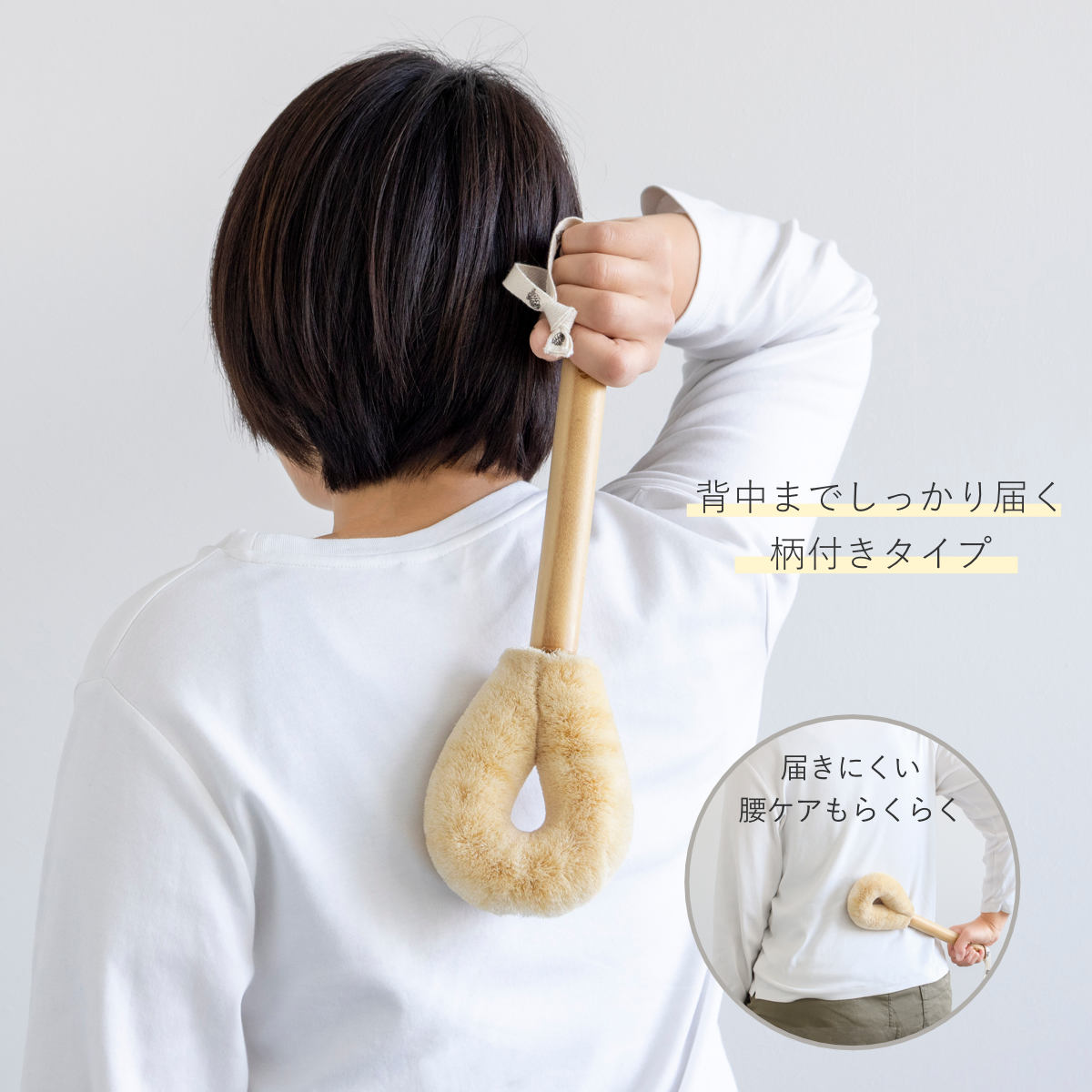 太めの柄付でしっかりと握れるので、手の届きにくい背中もラクに洗えます。無理のない動きで全身を心地よくケアできるのでどなたでも快適にお使いいただけます。