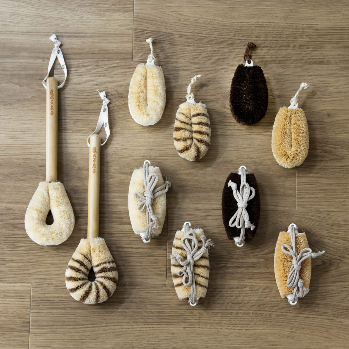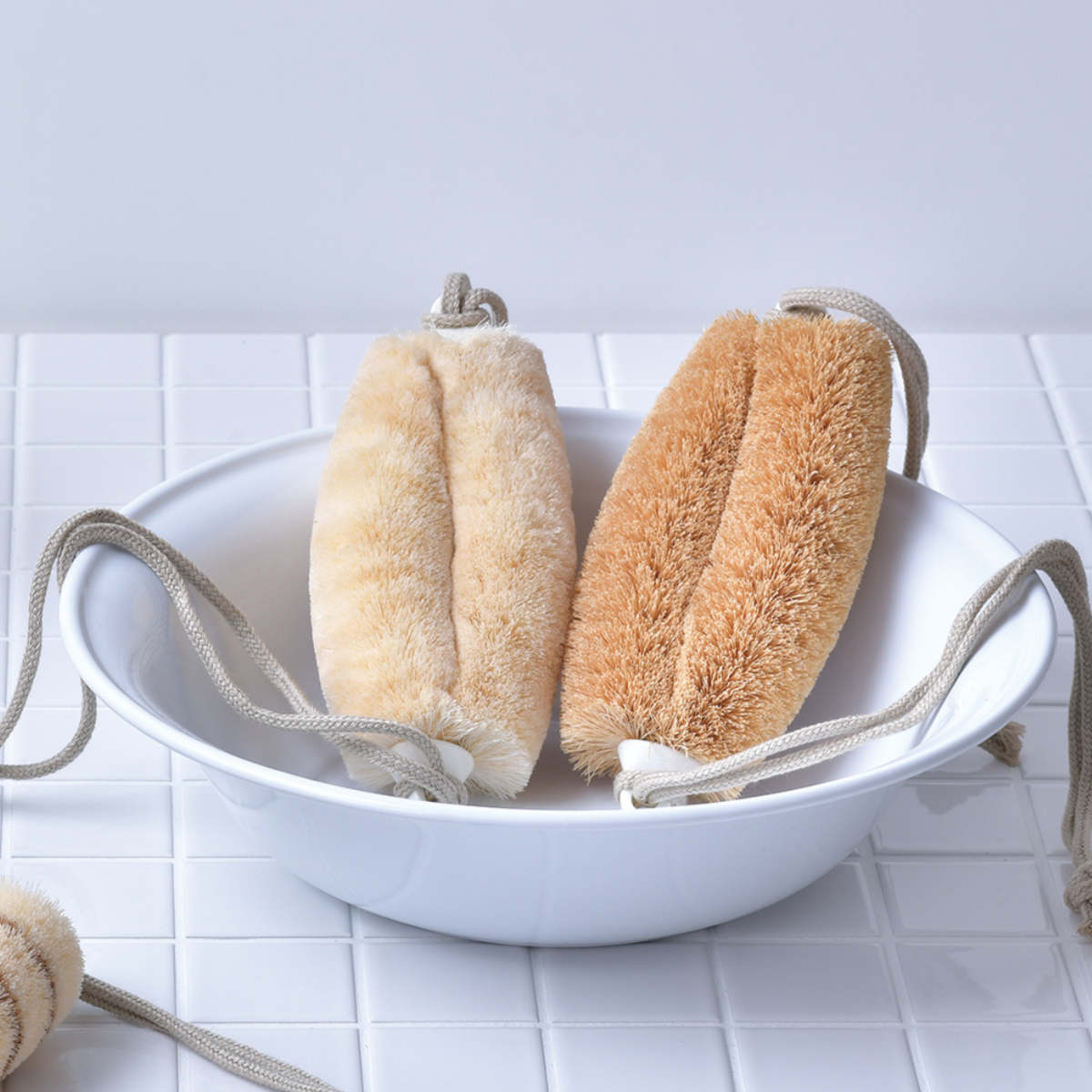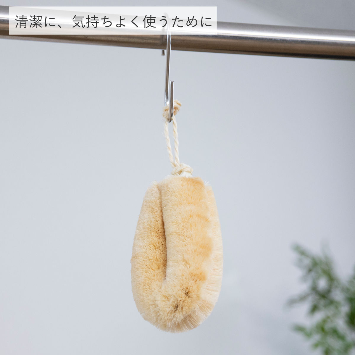 亀の子束子と同じ素材で作られたシリーズの中でいちばんかためのボディケアたわしです。しっかりとした洗い心地で、たわし洗いに慣れた方から“頼れる存在”として支持されています。使うほどに手になじむ絶妙な肌ざわりに。毎日のケアの中で、自分だけのたわしへと育てていく楽しみも感じられます。