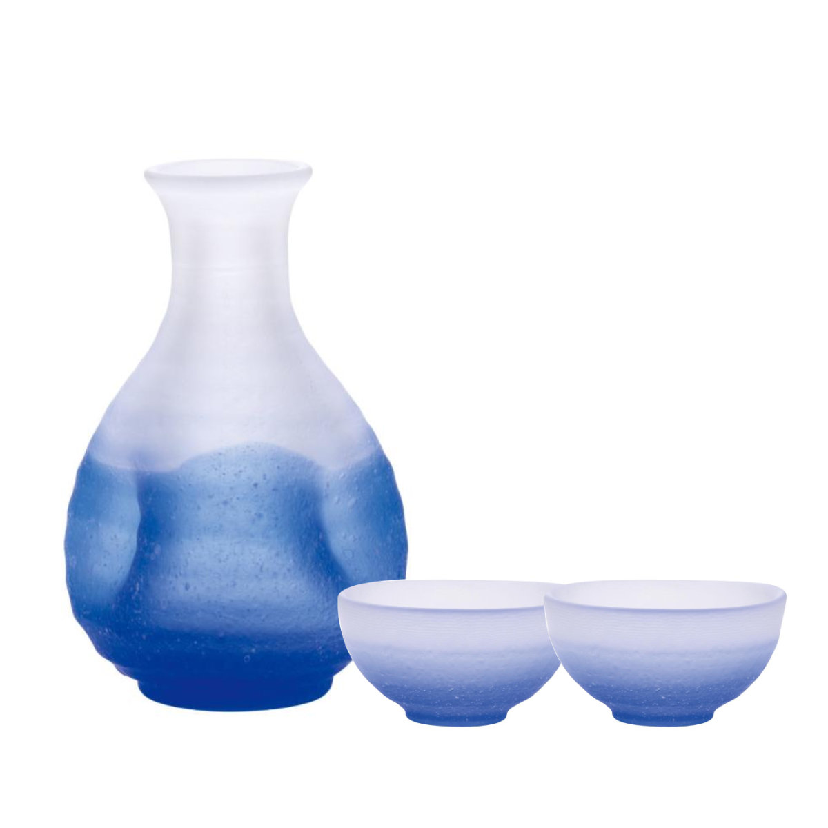 淡いブルーの徳利とぐいのみ2客の3点セットです。徳利は手になじむ丸みのあるフォルムと、注ぎやすい口元のデザインが特長で、冷酒はもちろん、ぬる燗にもお使いいただけます。