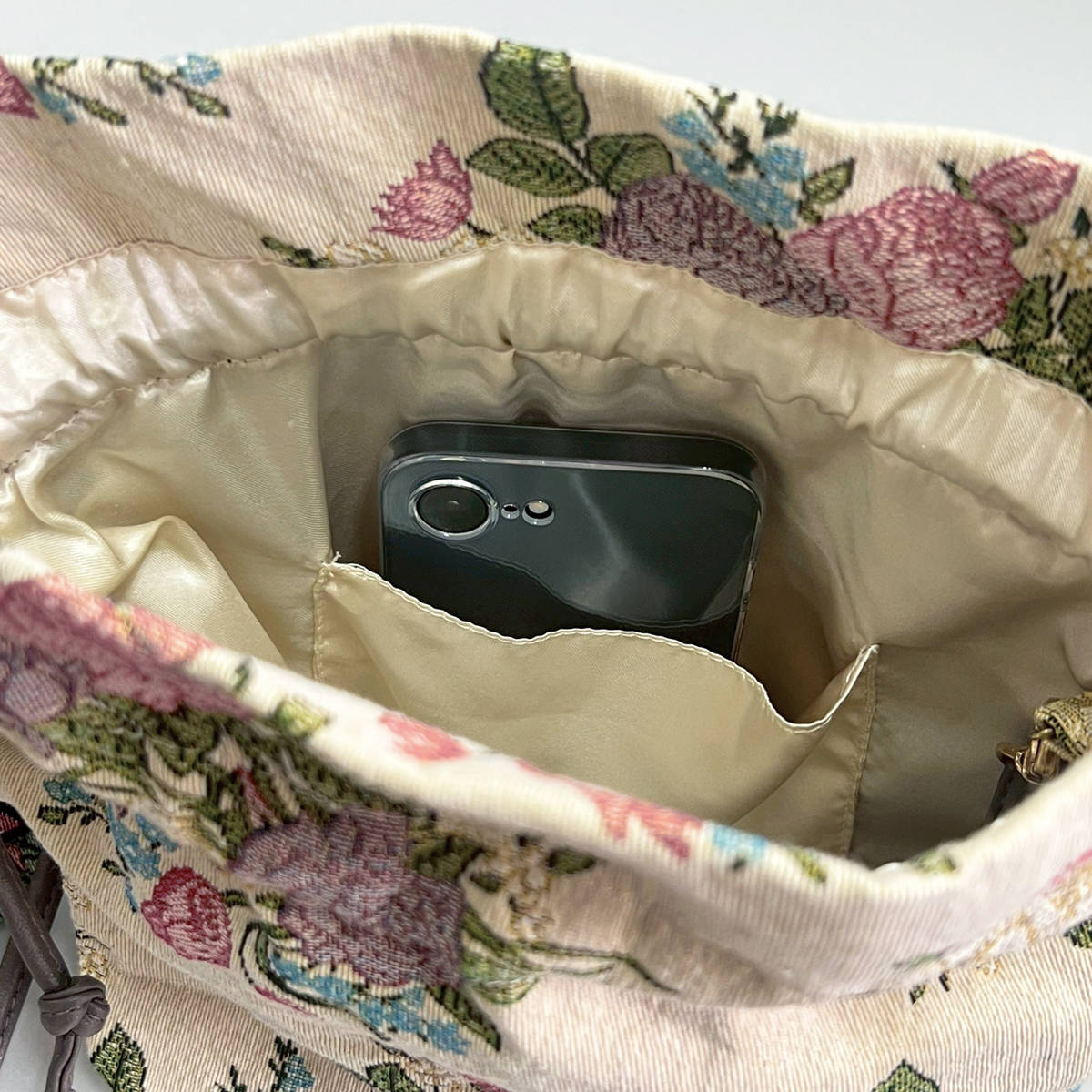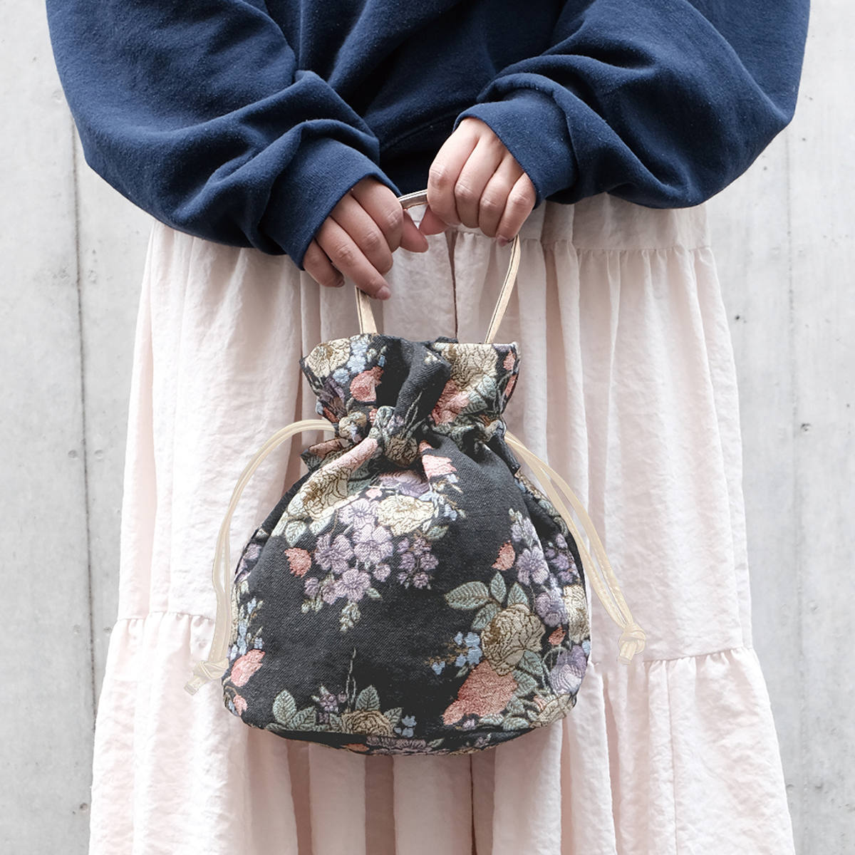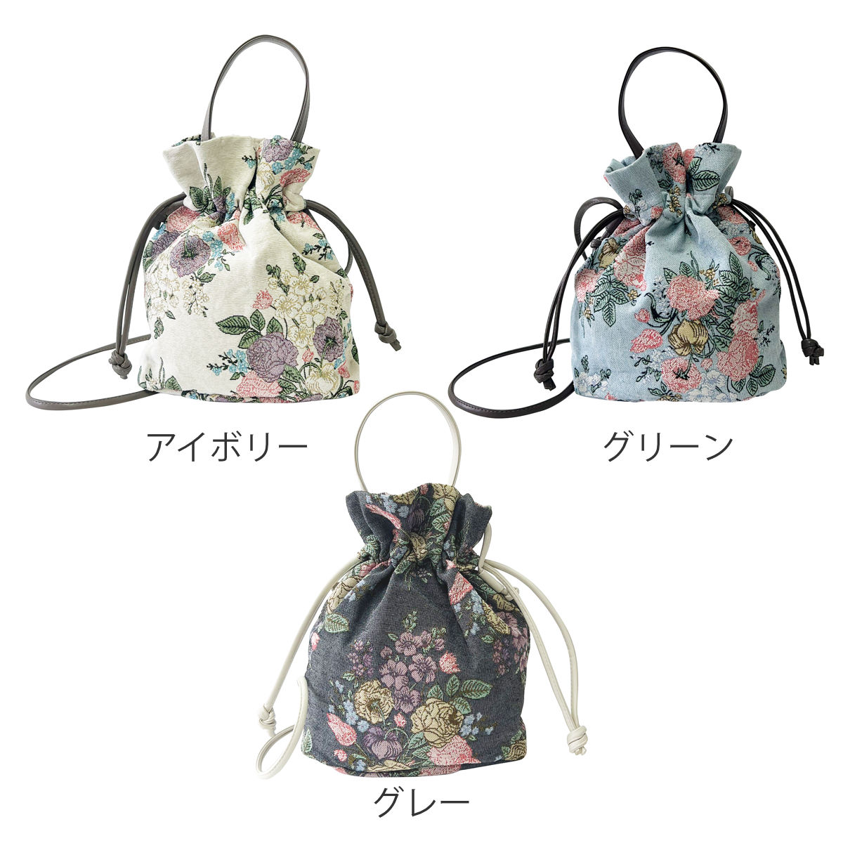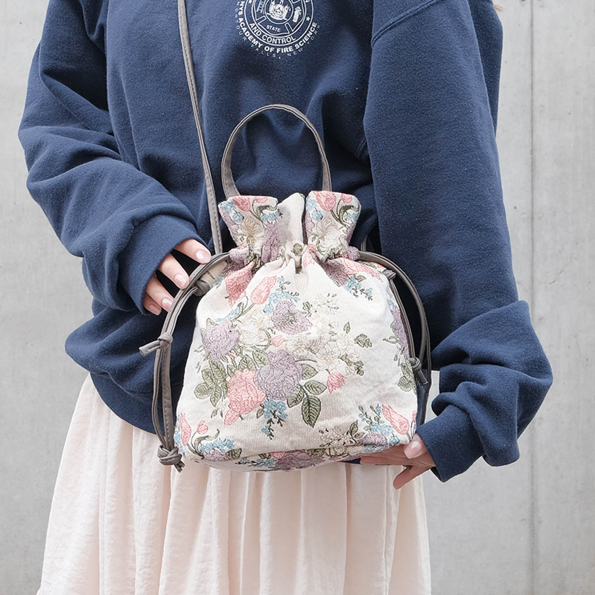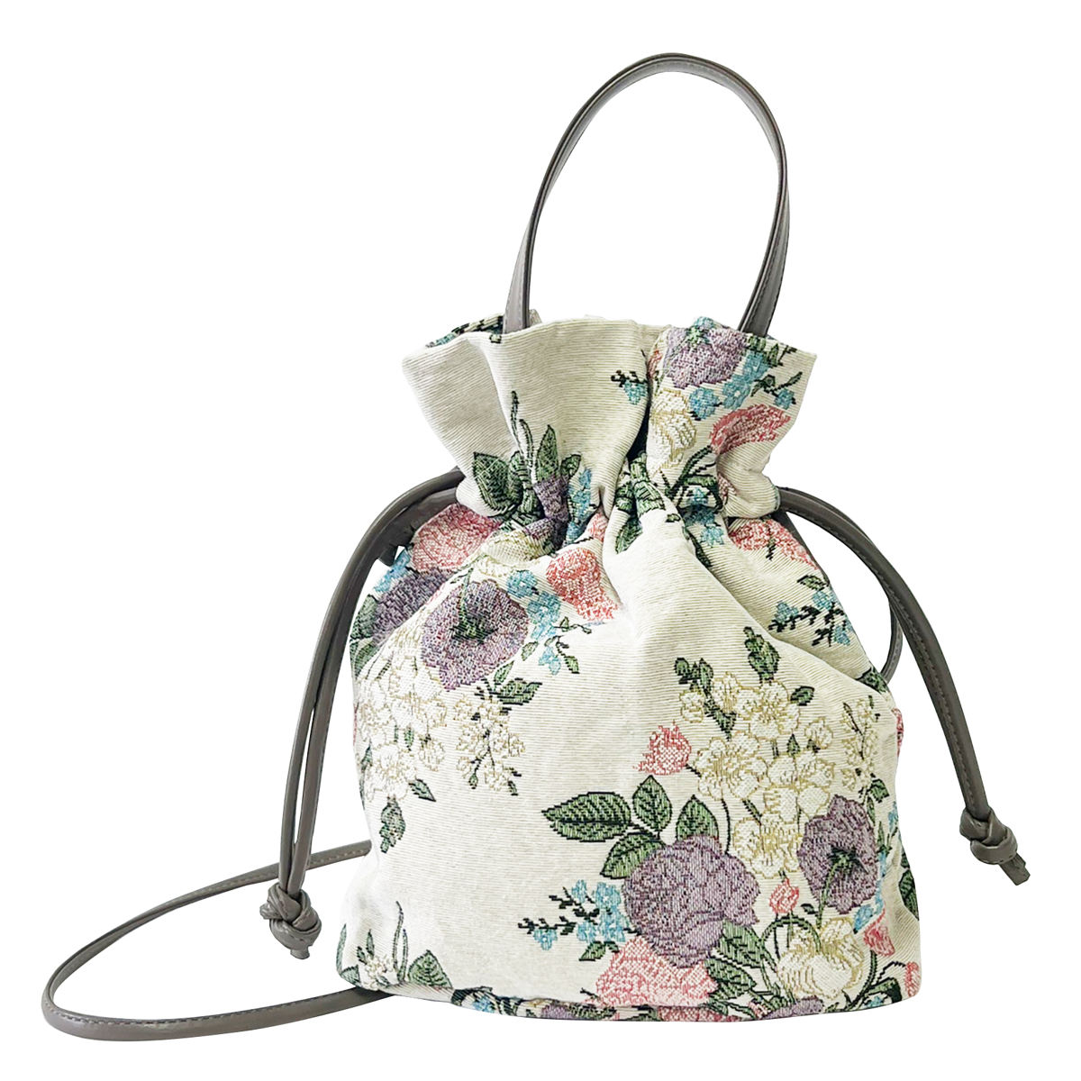 3way仕様で使い勝手の良い巾着ポシェットです。華やかな花柄デザインがコーディネートのアクセントになり、装いにさりげない女性らしさをプラスしてくれます。