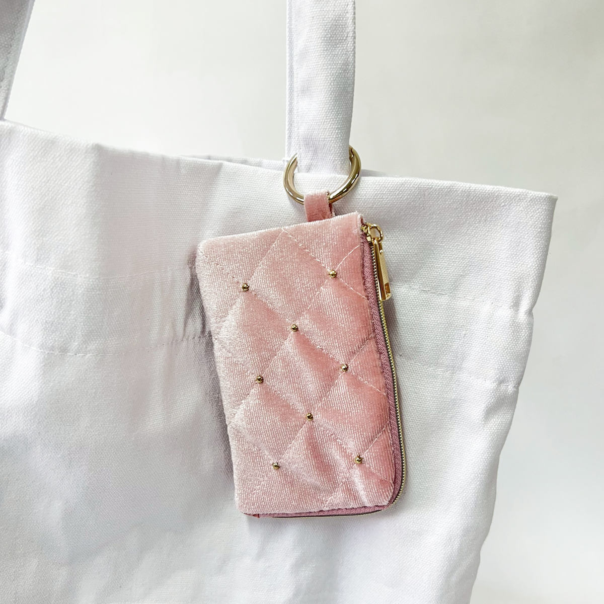 やさしいベロア素材が可愛い、ふんわりとした質感のコンパクトポーチです。カラビナ付きだからバッグに簡単に取り付けでき、イヤフォンやリップなどの小物をすっきり収納します。