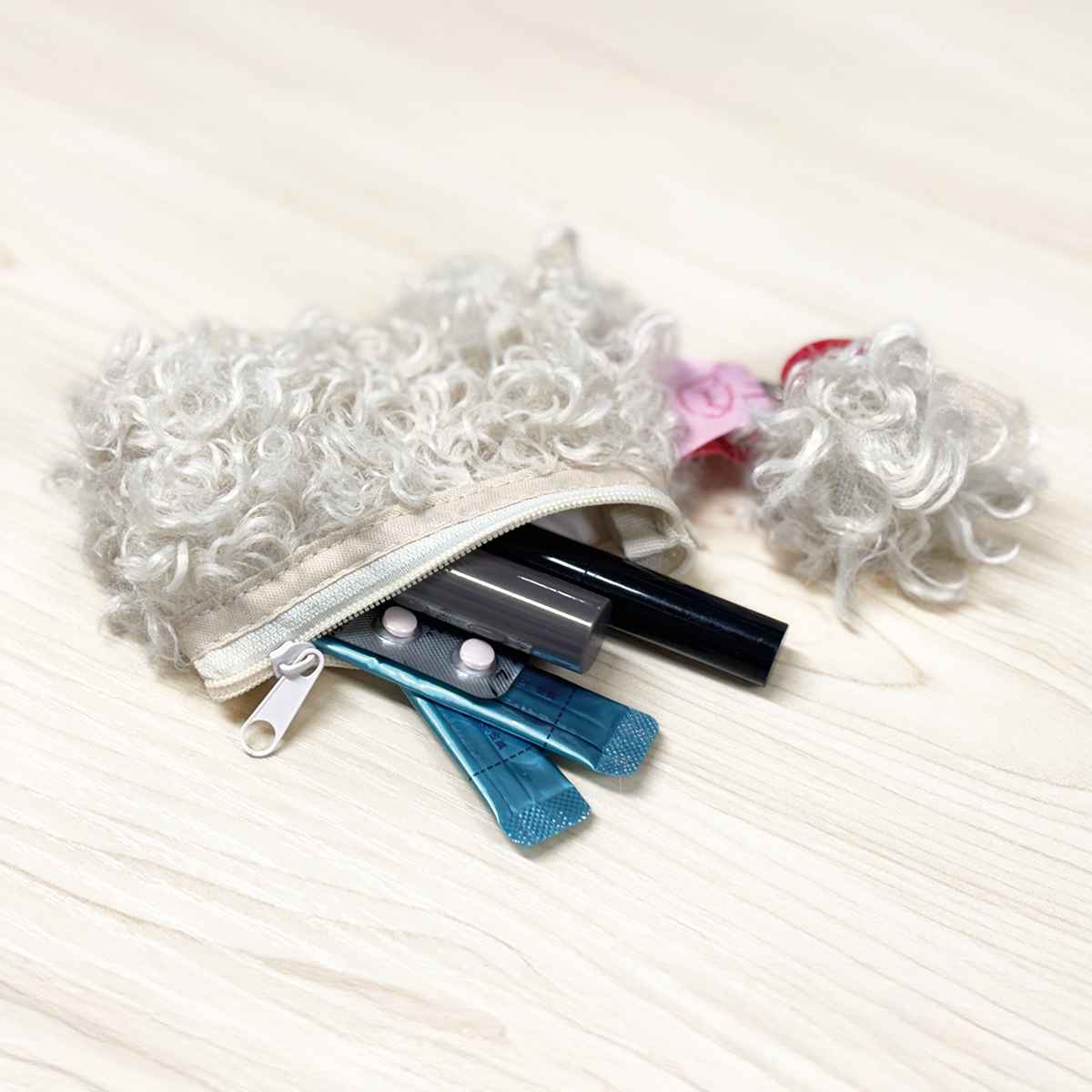 トイプードルのような、フワモフで気持ちいい手触りのポーチ(Sサイズ)です。お薬やリップなどかばんの中の細々した小物をまとめたり、アクセサリーや鍵入れにもおすすめです。見た目の可愛さはもちろん、触れるたびに癒される心地よさが魅力です。
