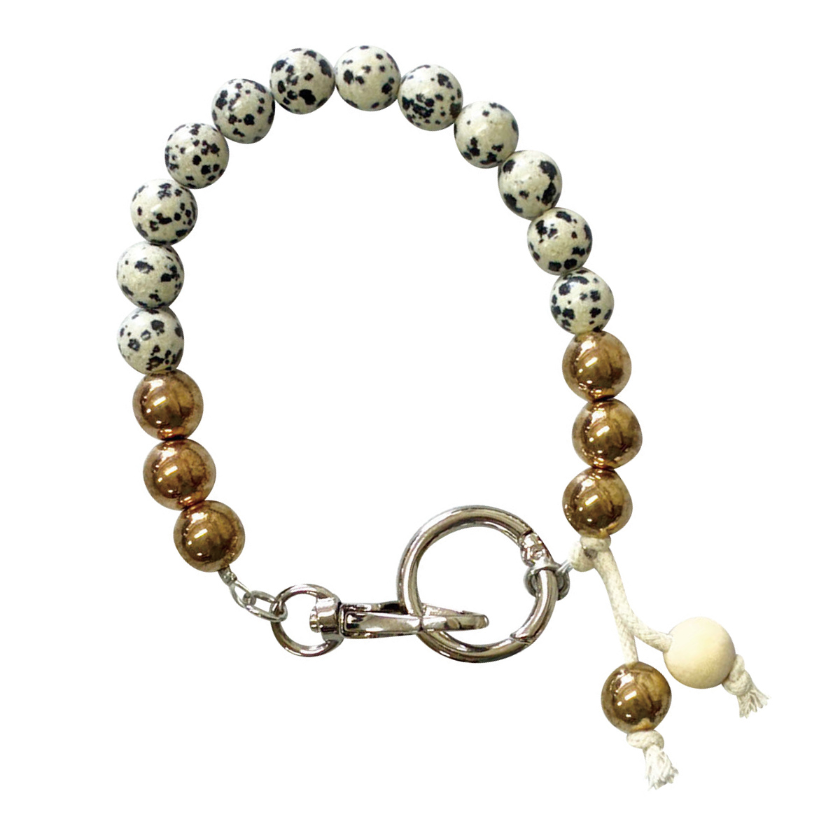 スマホの落下を防止しつつ、ブレスレット感覚で付けられるハンドストラップです。メタルビーズ×ウッドビーズの異素材ミックスが楽しいデザインに仕上げました。
