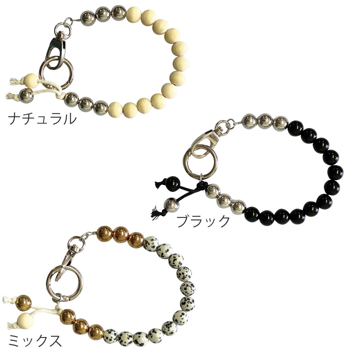 | 材質 | 金具:亜鉛合金 本体共通部分:ABS樹脂、ステンレス、綿 ナチュラル:木 ブラック:アクリル ミックス:天然石 |