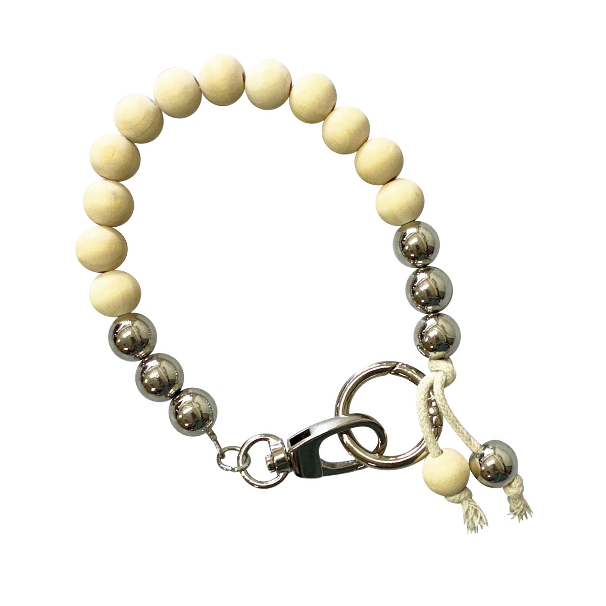 スマホの落下を防止しつつ、ブレスレット感覚で付けられるハンドストラップです。メタルビーズ×ウッドビーズの異素材ミックスが楽しいデザインに仕上げました。