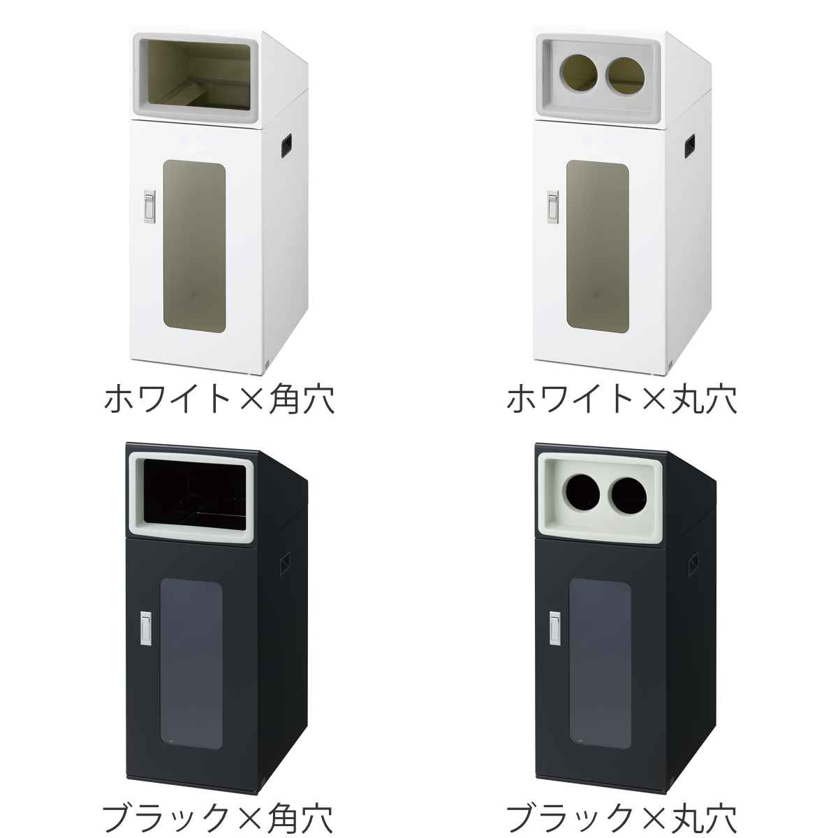 投入口の形状は角穴・丸穴の2種類から選べます。角穴は口が広いのでゴミが入れやすく、丸穴は缶・ペットボトル専用として認識しやすいので誤投入を防ぎます。