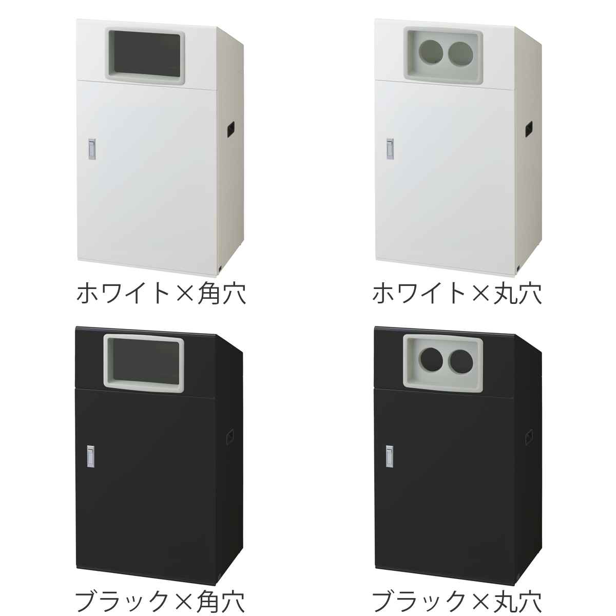 投入口の形状は角穴・丸穴の2種類から選べます。角穴は口が広いのでゴミが入れやすく、丸穴は缶・ペットボトル専用として認識しやすいので誤投入を防ぎます。