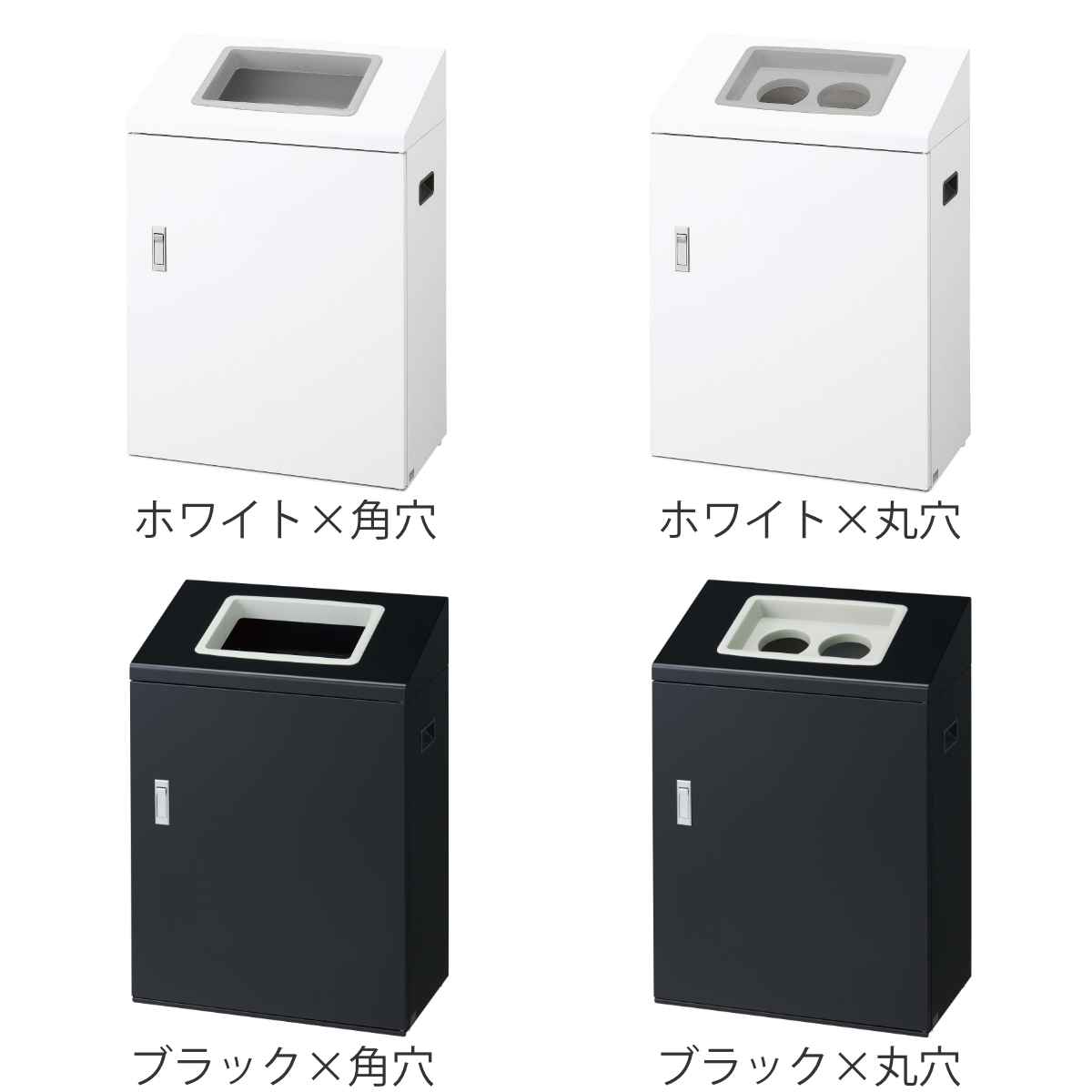 投入口の形状は角穴・丸穴の2種類から選べます。角穴は口が広いのでゴミが入れやすく、丸穴は缶・ペットボトル専用として認識しやすいので誤投入を防ぎます。