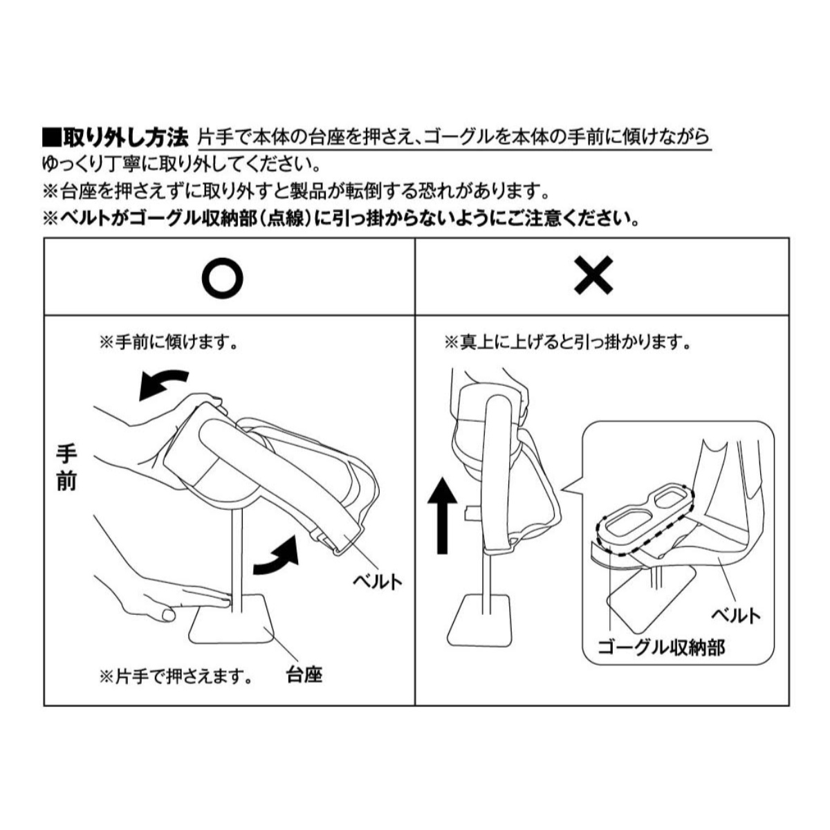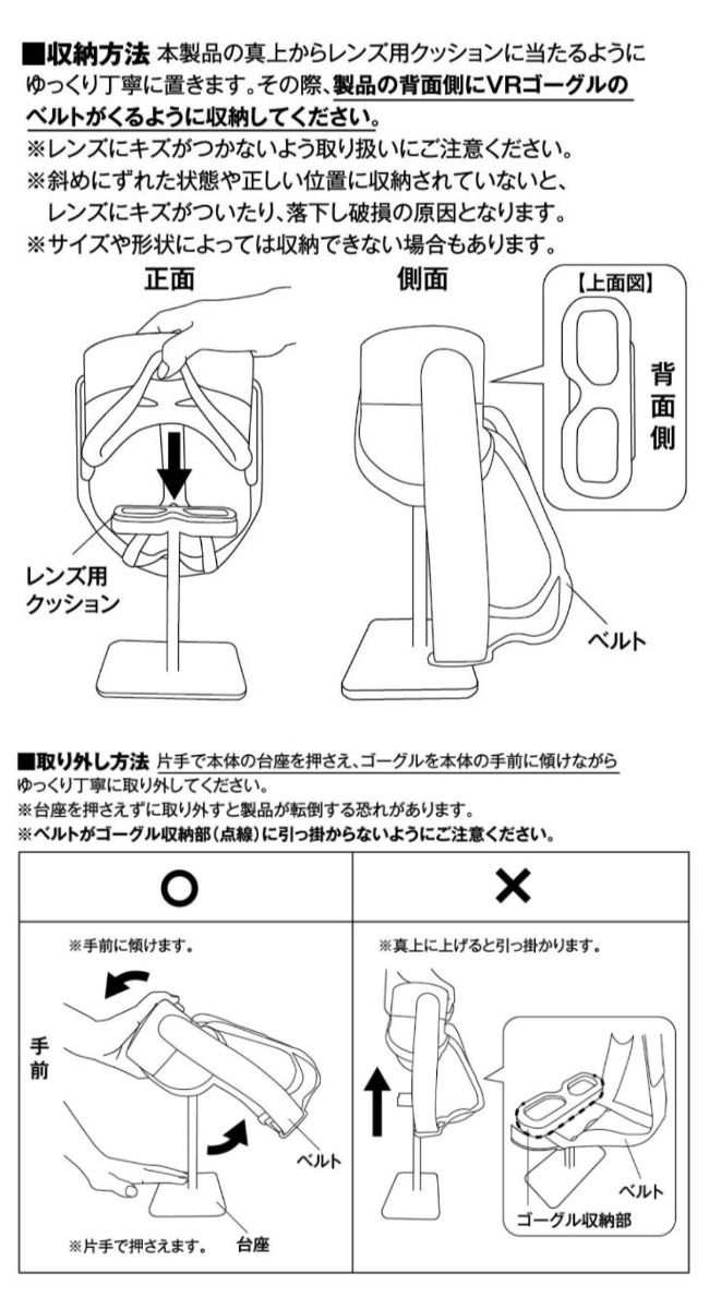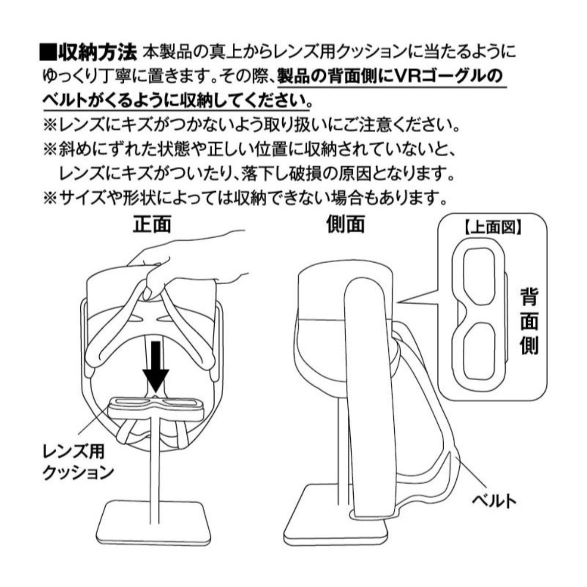 | 注意事項 | ※VRゴーグルは付属してません ※スマートフォン用VRゴーグルのサイズや形状によっては収納できない場合があります ※収納するスマートフォン用VRゴーグルの取扱説明書を読んでご使用ください |