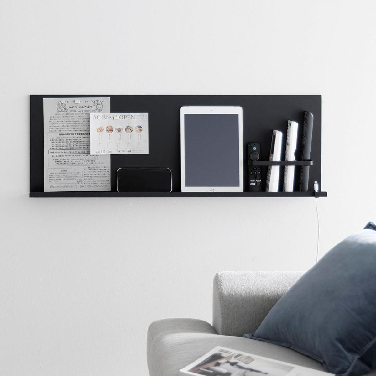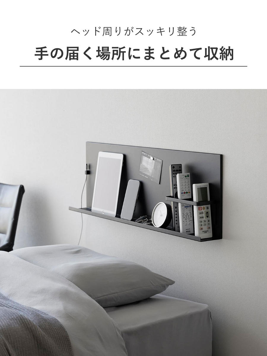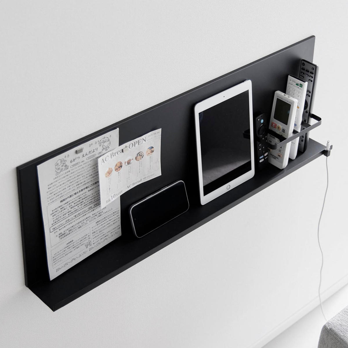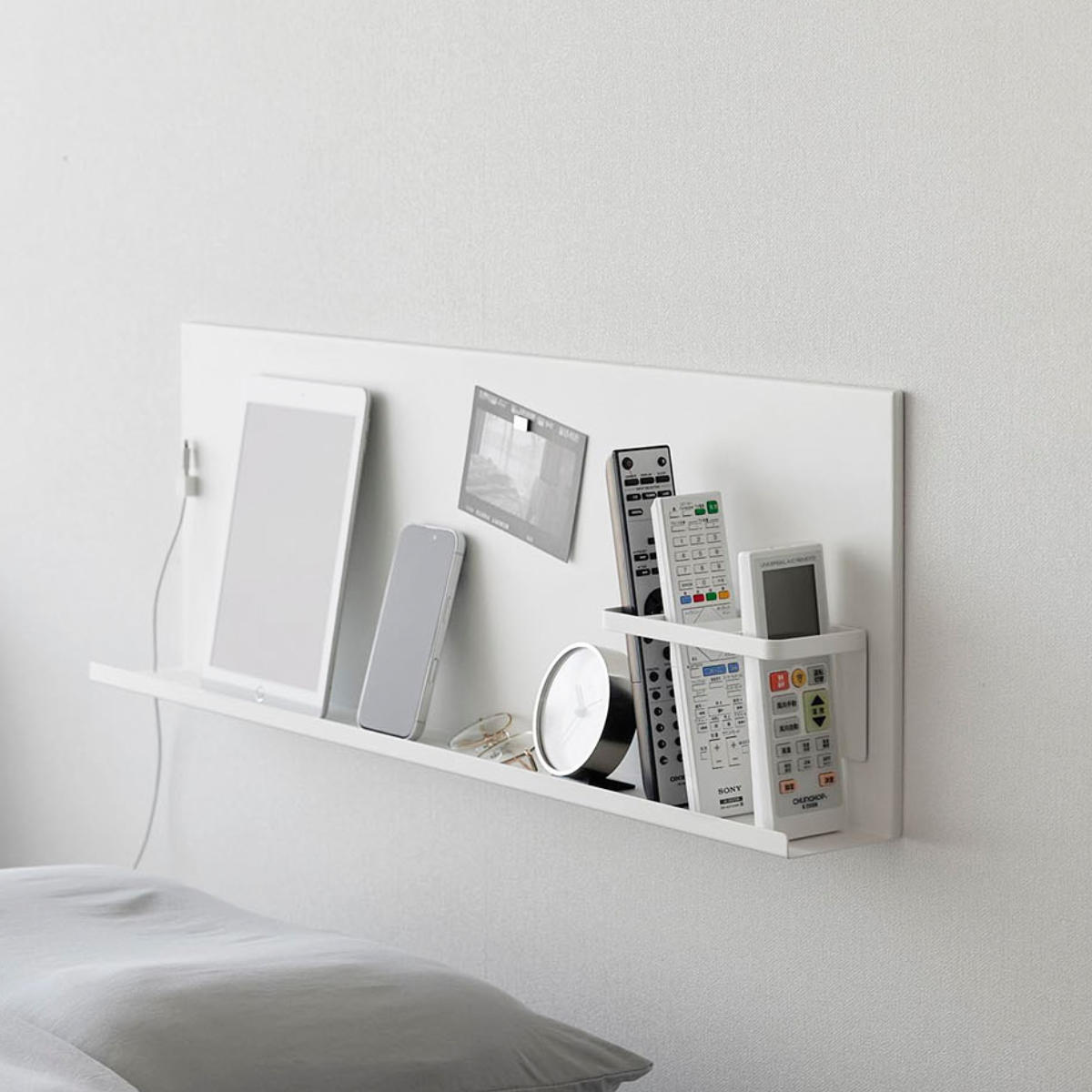 石こうボードピンで簡単に取り付けられるリモコンホルダー付きスチールパネルです。ヘッドボードやサイドボードとしても使え、リモコンやタブレットなどの小物を手の届く場所にスッキリ収納できます。トレーにはシリコーンマット付きで、収納物をキズから守ります。