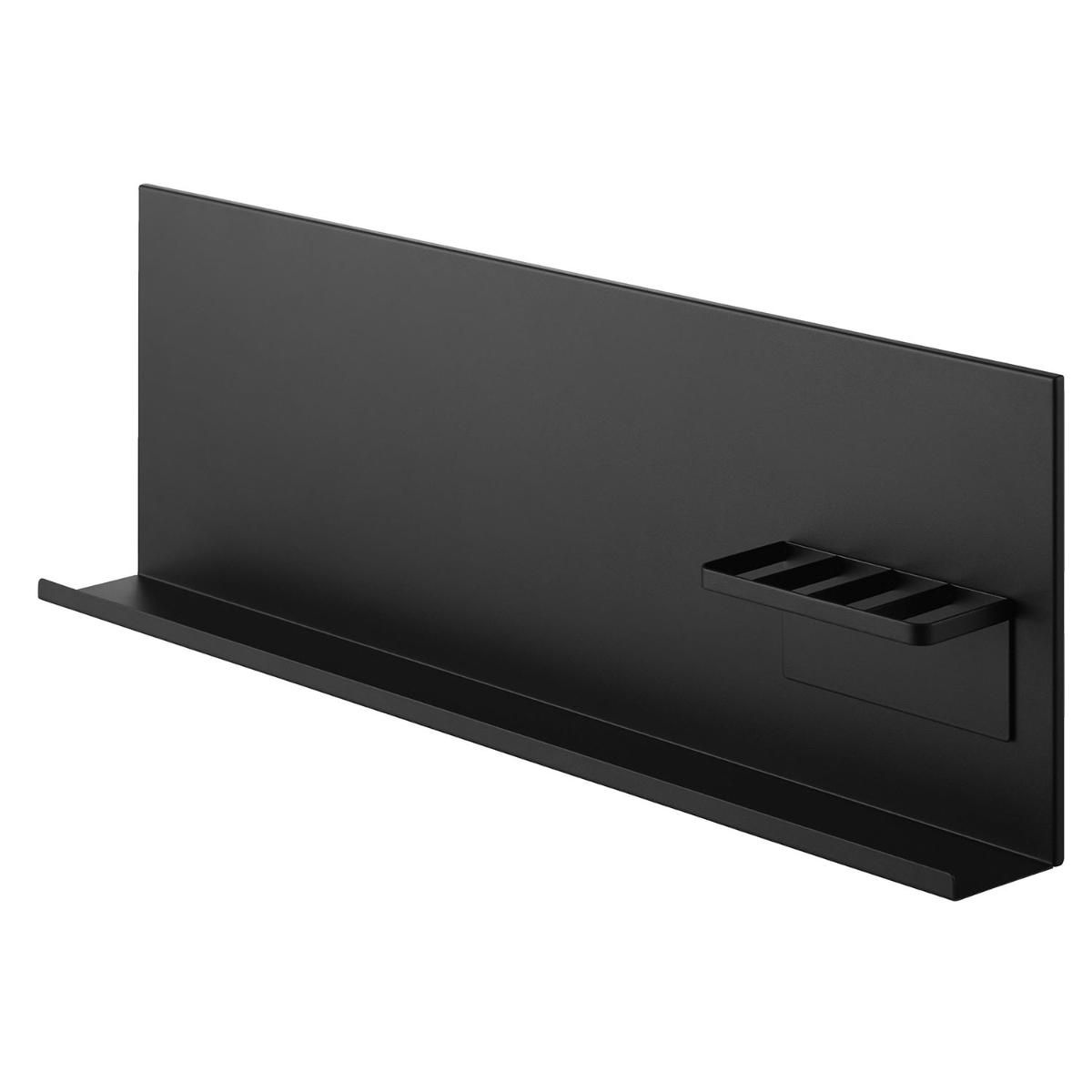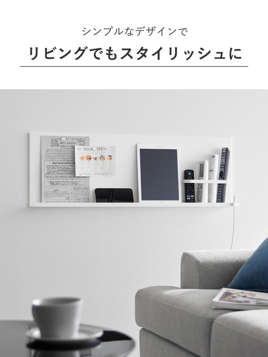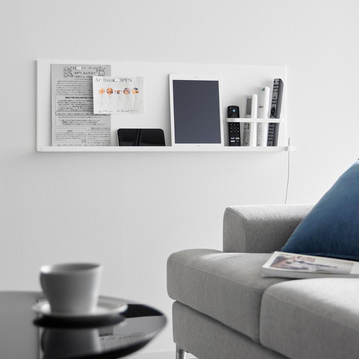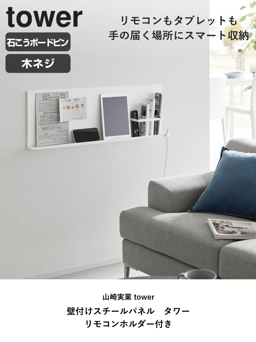 石こうボードピンで簡単に取り付けられるリモコンホルダー付きスチールパネルです。ヘッドボードやサイドボードとしても使え、リモコンやタブレットなどの小物を手の届く場所にスッキリ収納できます。トレーにはシリコーンマット付きで、収納物をキズから守ります。