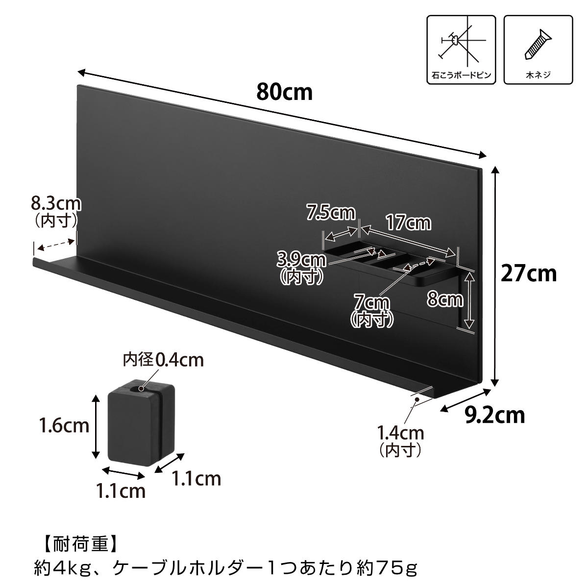 | サイズ | 約 幅80×奥行9.2×高さ27(cm) リモコンホルダー:幅17×奥行7.5×高さ8cm ケーブルホルダー:幅1.1×奥行1.1×高さ1.6cm(1つあたり) 【内寸】 本体トレー部:幅80×奥行8.3×高さ1.4cm リモコンホルダー部1か所あたり:幅3.9×奥行7cm ケーブルホルダー1つあたり:内径4mm |