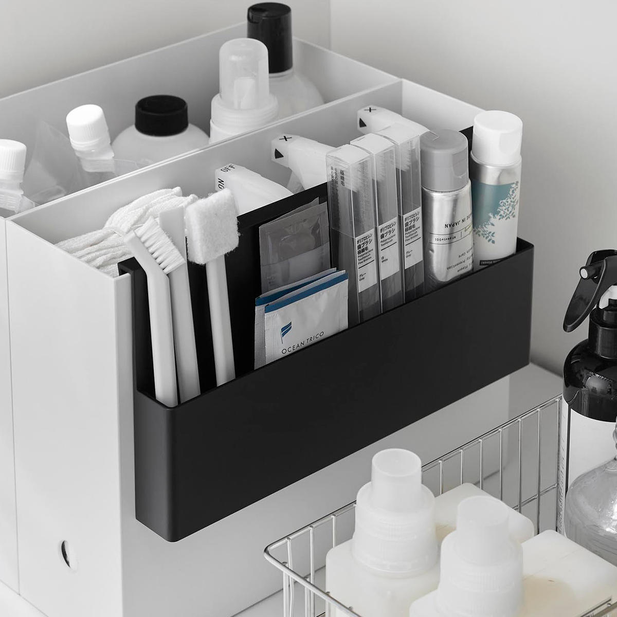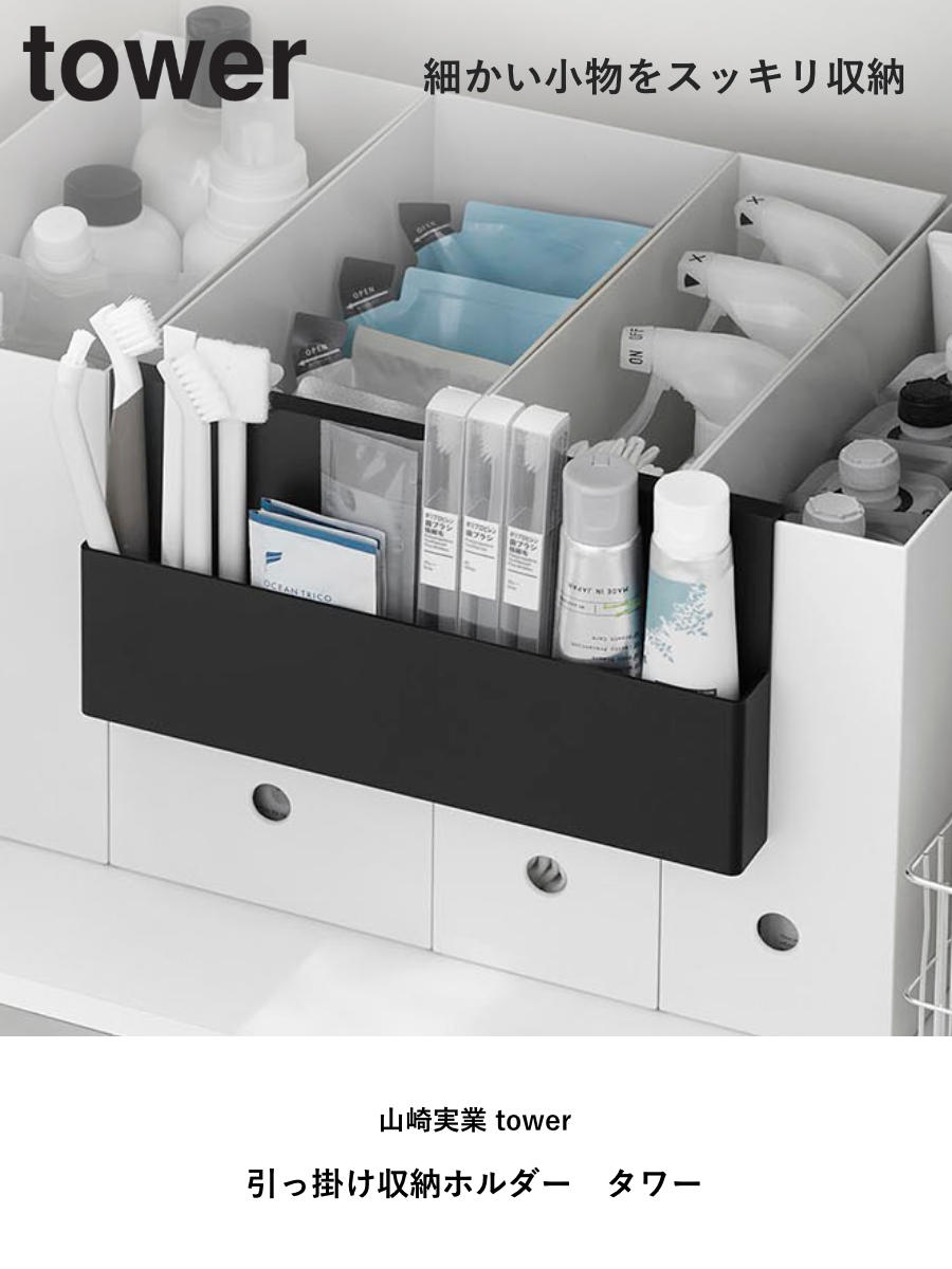 ファイルボックスやワゴンに引っ掛けて使える収納ホルダーです。洗面周りの小物整理に便利で、歯ブラシや歯磨き粉のストック、小さなお掃除ブラシなどをスッキリ収納できます。