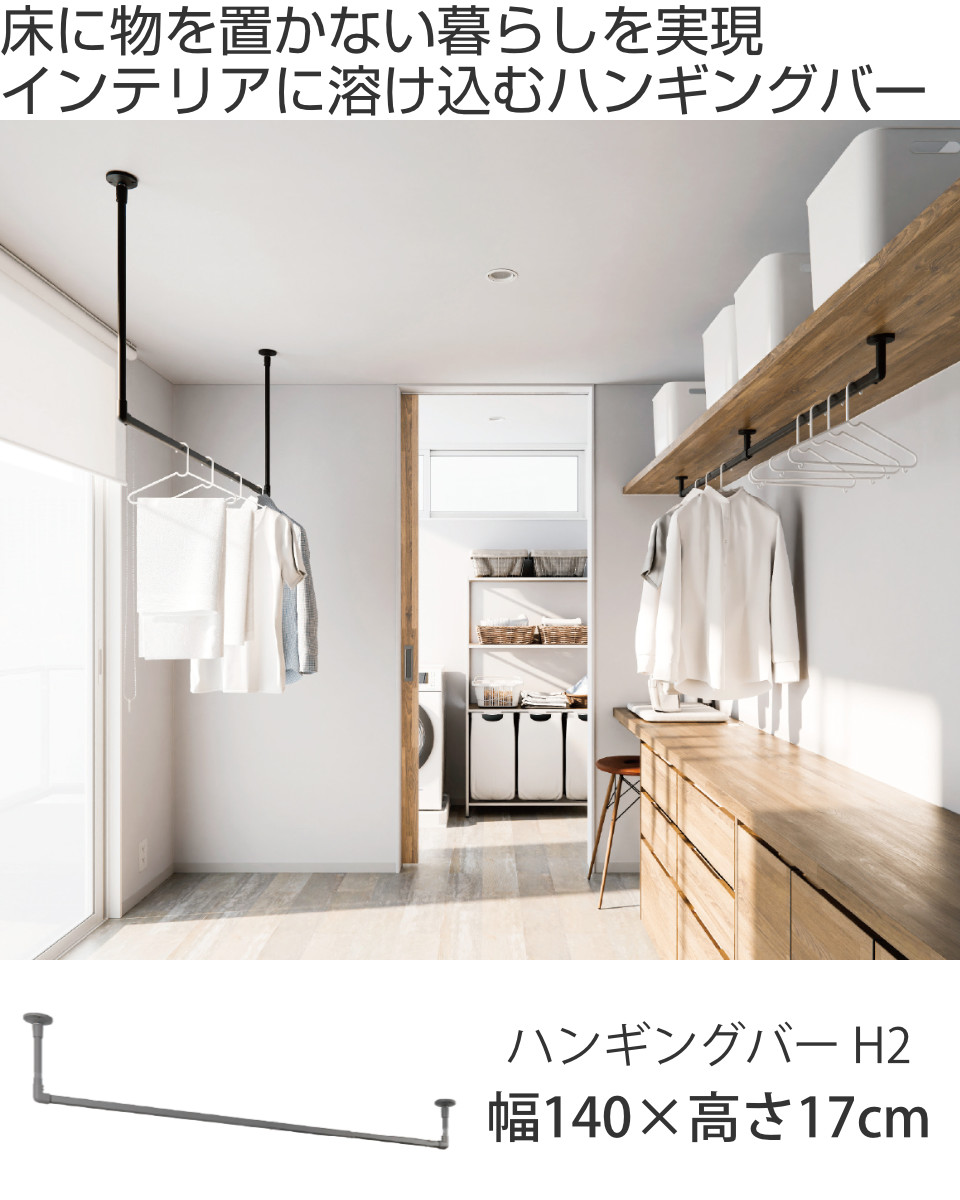 モノトーンのハンギングバーは、マットな質感に仕上げられているためインテリア性が高く、ランドリーやリビング、ウォークインクローゼットなどへも設置できます。洗濯物を干す用途だけでなく、収納スペースの確保やディスプレイバーとしての使用もお勧めです。