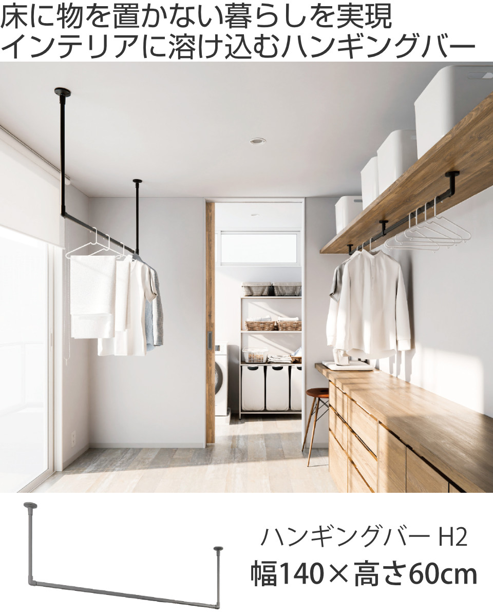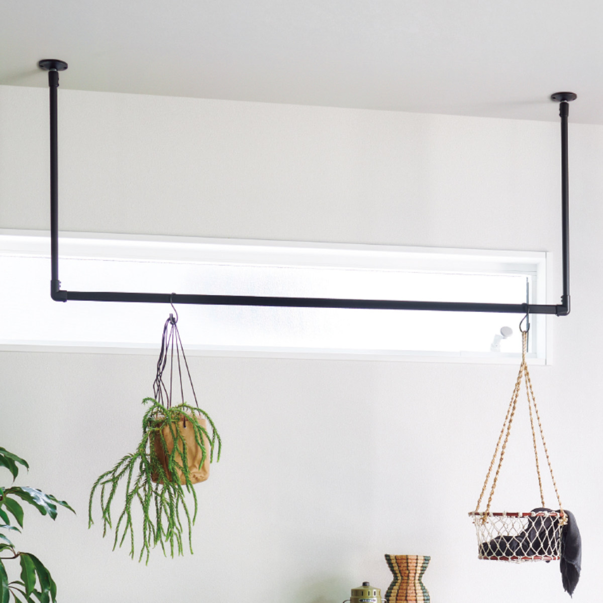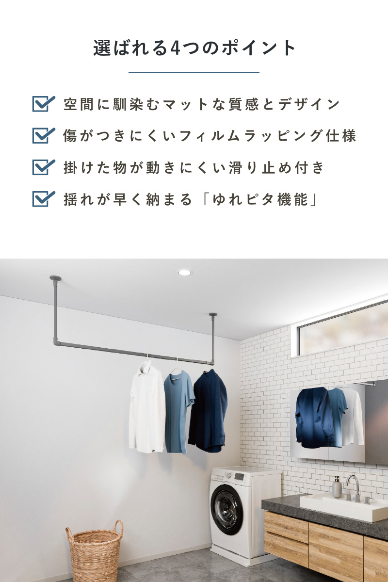 モノトーンのハンギングバーは、マットな質感に仕上げられているためインテリア性が高く、ランドリーやリビング、ウォークインクローゼットなどへも設置できます。洗濯物を干す用途だけでなく、収納スペースの確保やディスプレイバーとしての使用もお勧めです。