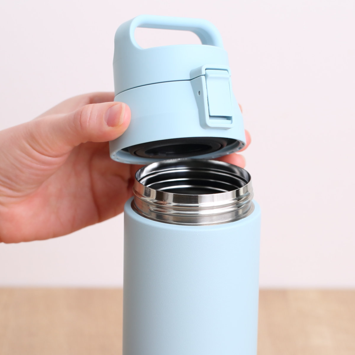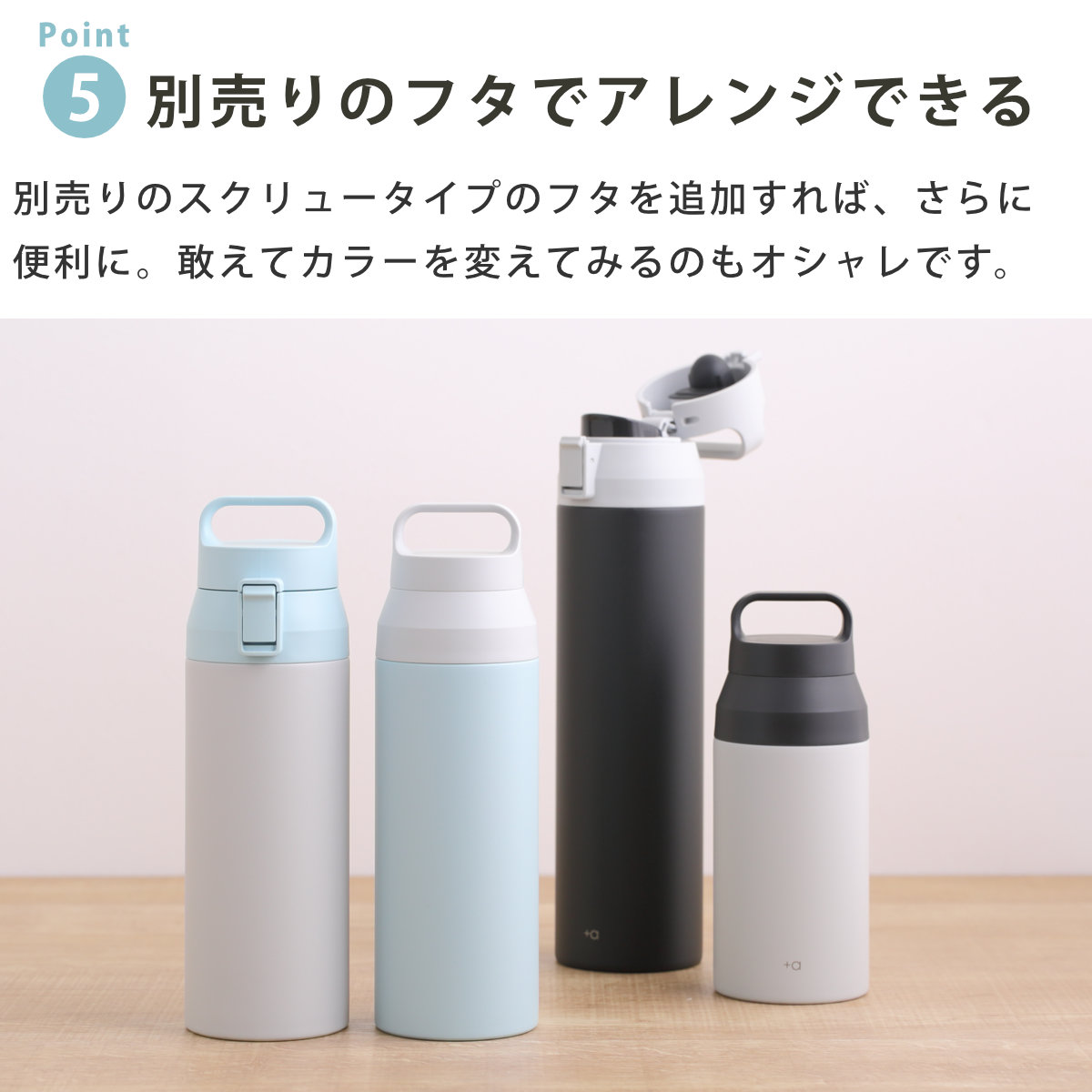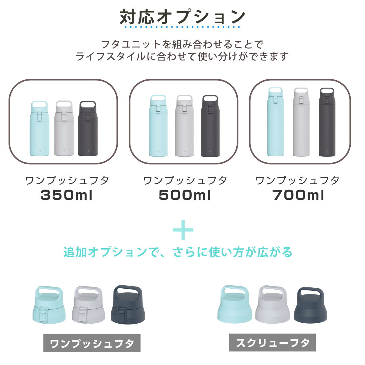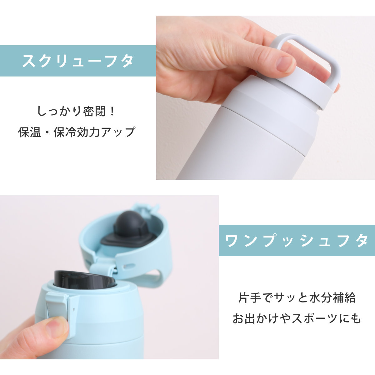 | 材質 | 上フタ・下フタ・飲み口:ポリプロピレン、ロックレバー:ABS樹脂、ストッパー:ポリアセタール、バネ・軸:ステンレス鋼、上フタパッキン・飲み口パッキン:シリコーンゴム 本体容器(内瓶・口部):ステンレス鋼、本体容器(胴部):ステンレス鋼(ポリエステル樹脂塗装) |