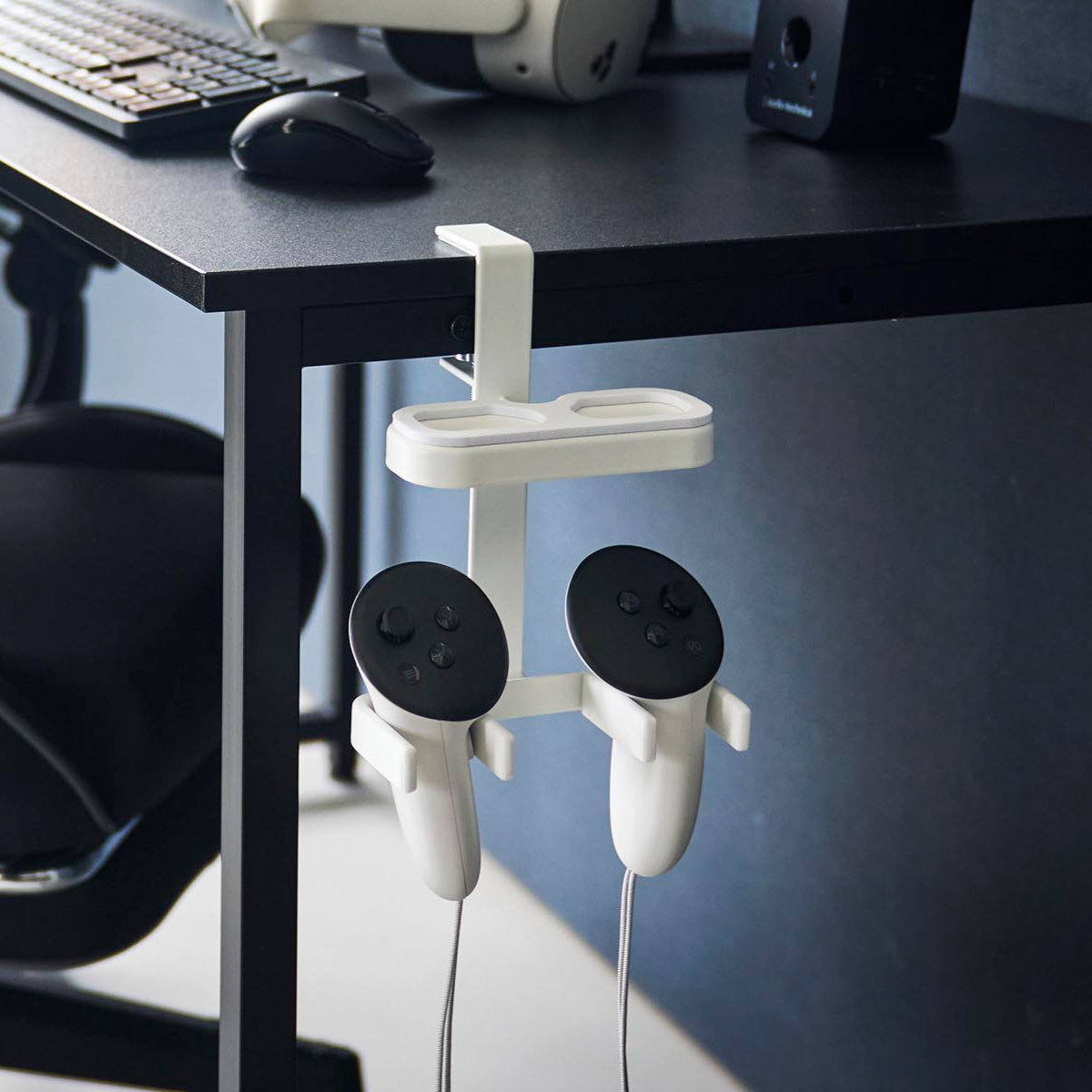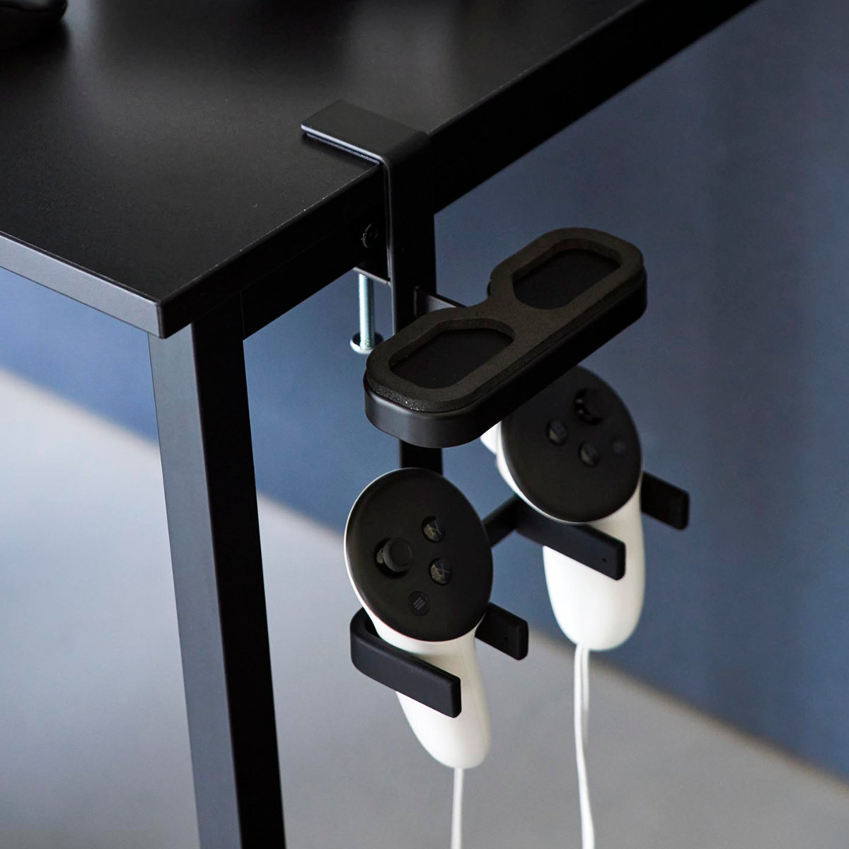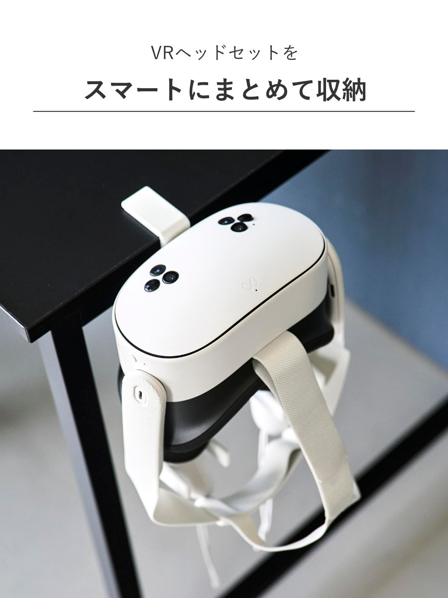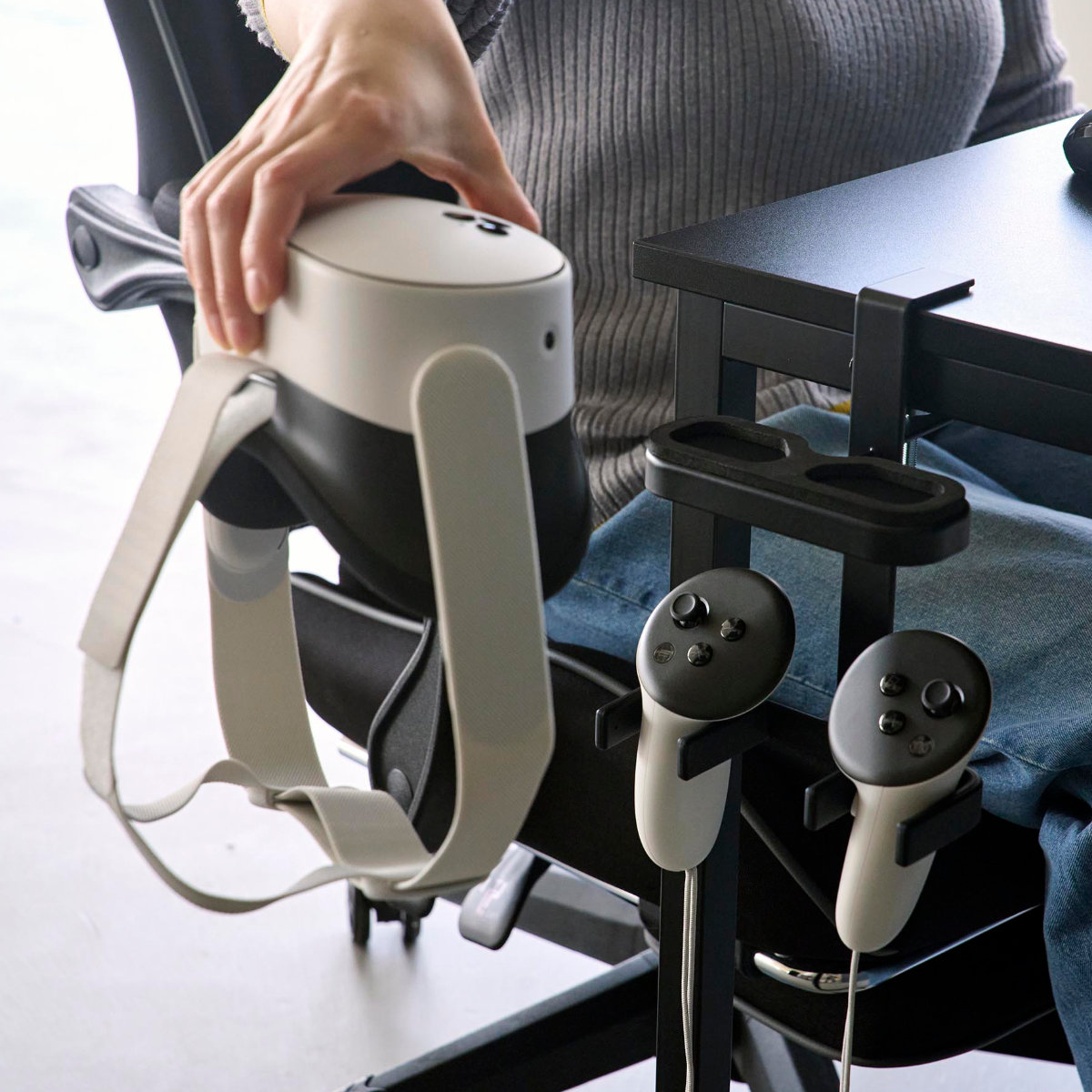 デスク横に設置できるVRゴーグルとコントローラー用の収納ラックは、VR機器を整理し、デスク周りをすっきりと保つための便利なアイテムです。