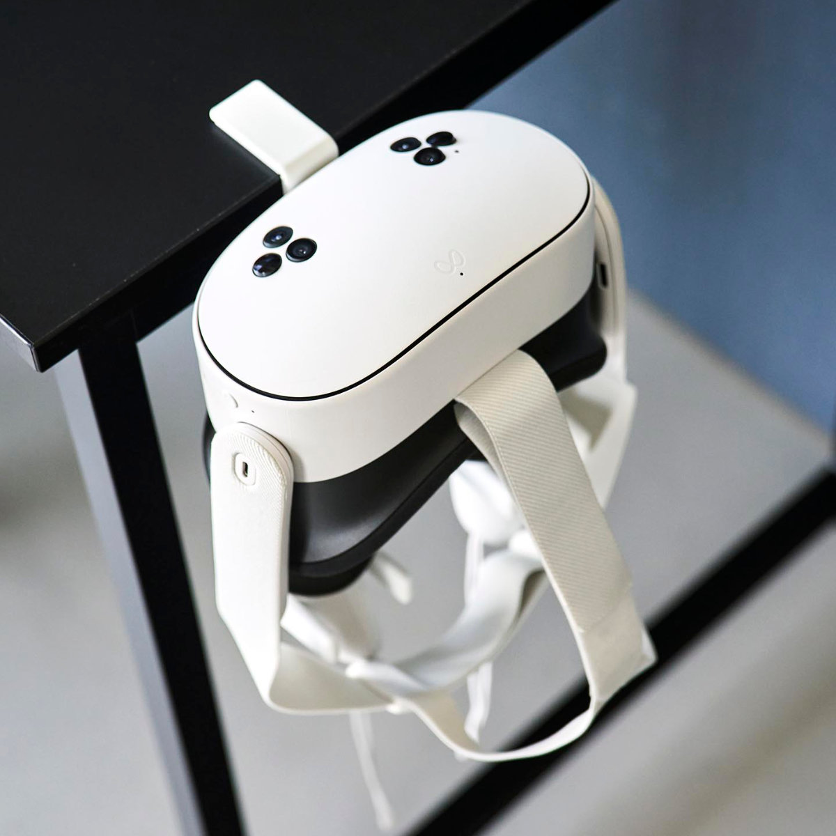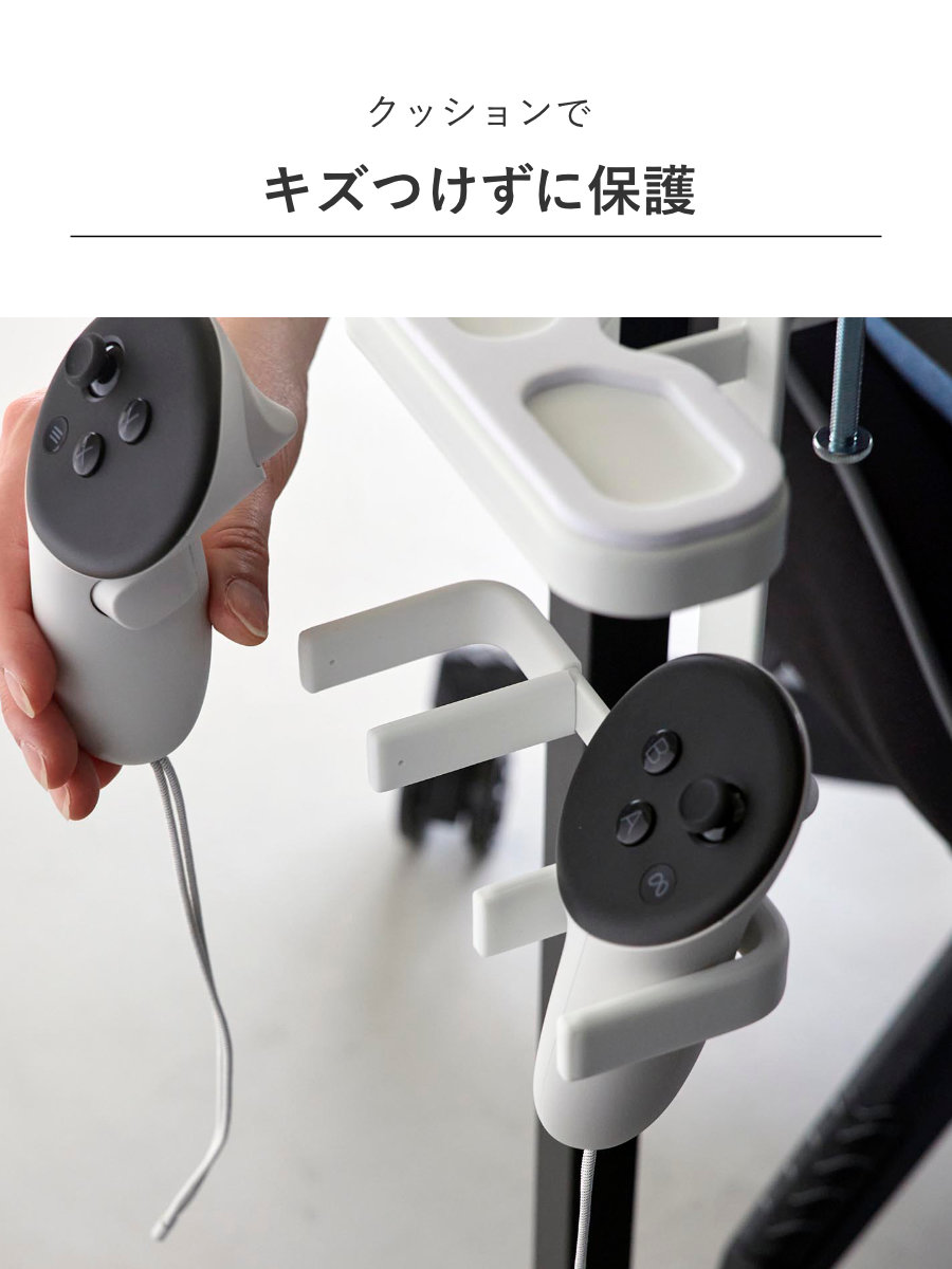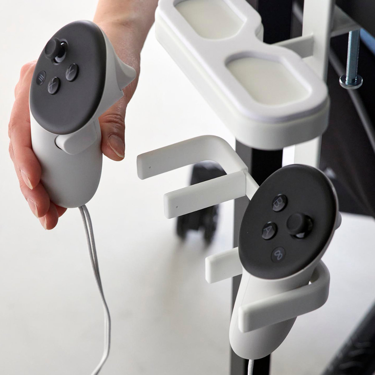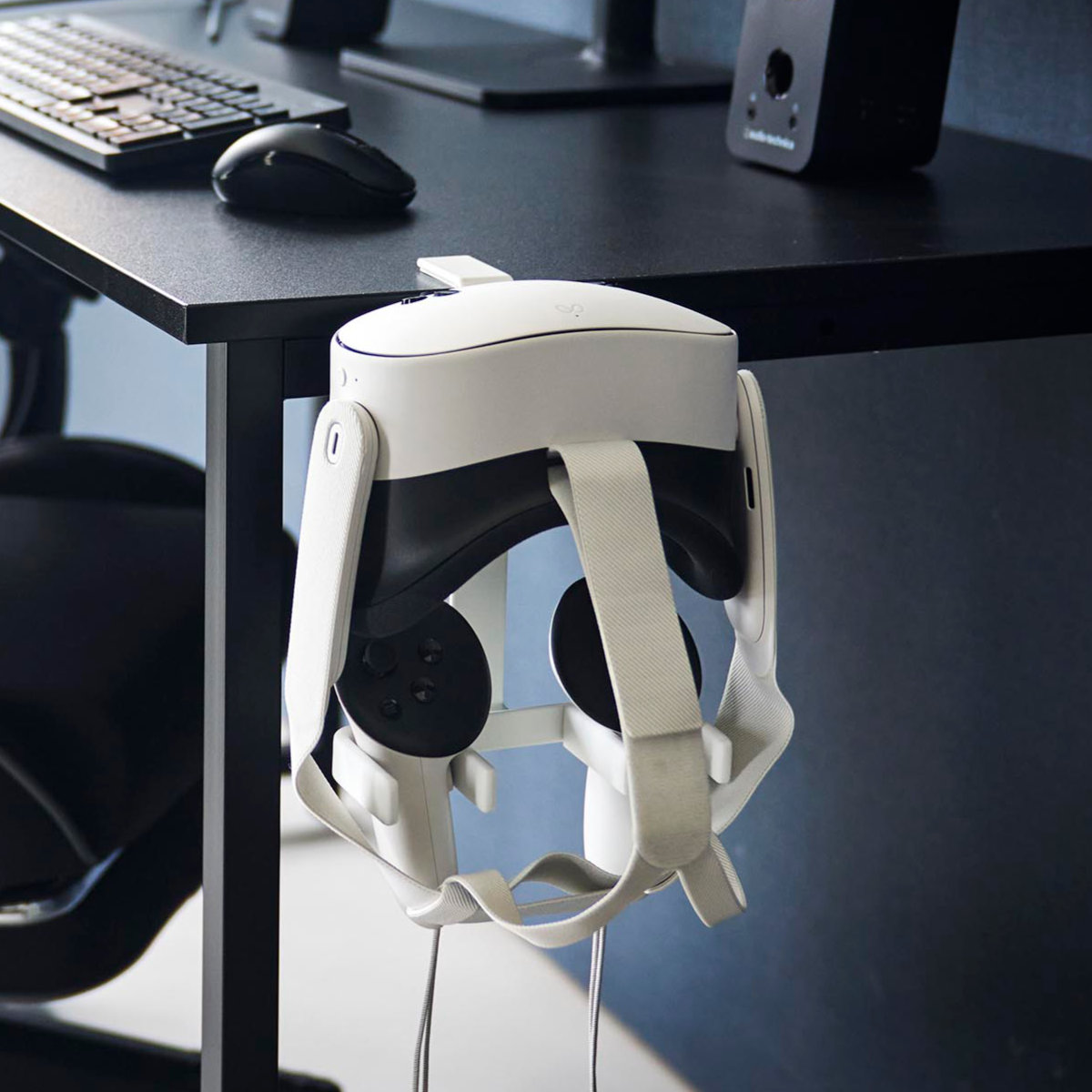 デスク横に設置できるVRゴーグルとコントローラー用の収納ラックは、VR機器を整理し、デスク周りをすっきりと保つための便利なアイテムです。