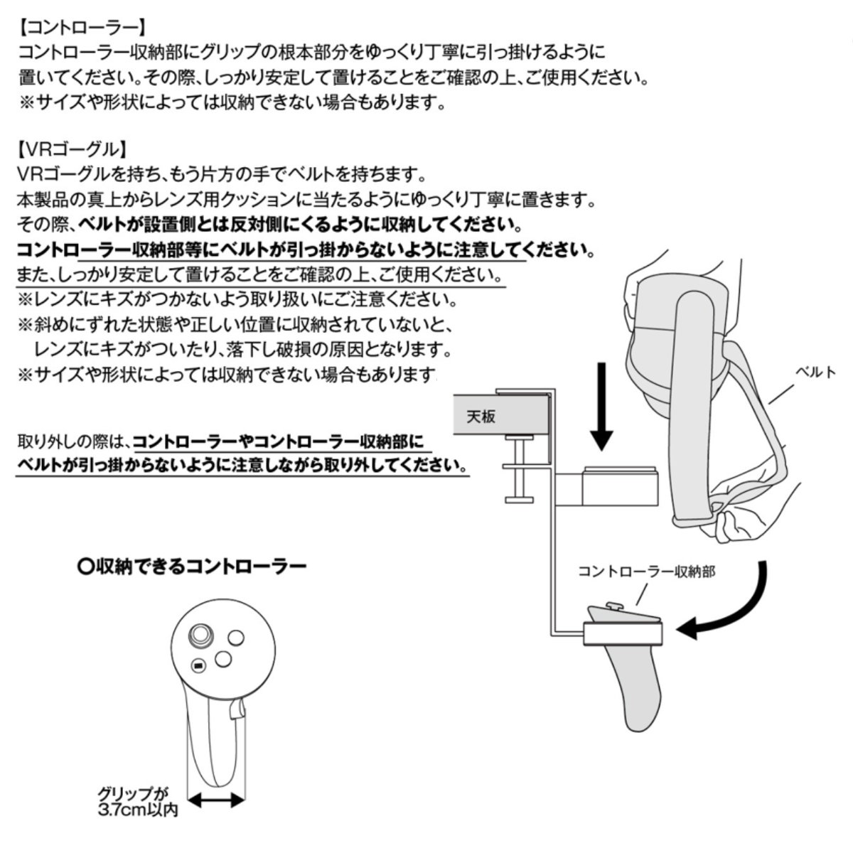 | 耐荷重 | ゴーグル収納部:1kg(静止荷重) コントローラー収納部1か所あたり:500g(静止荷重) |