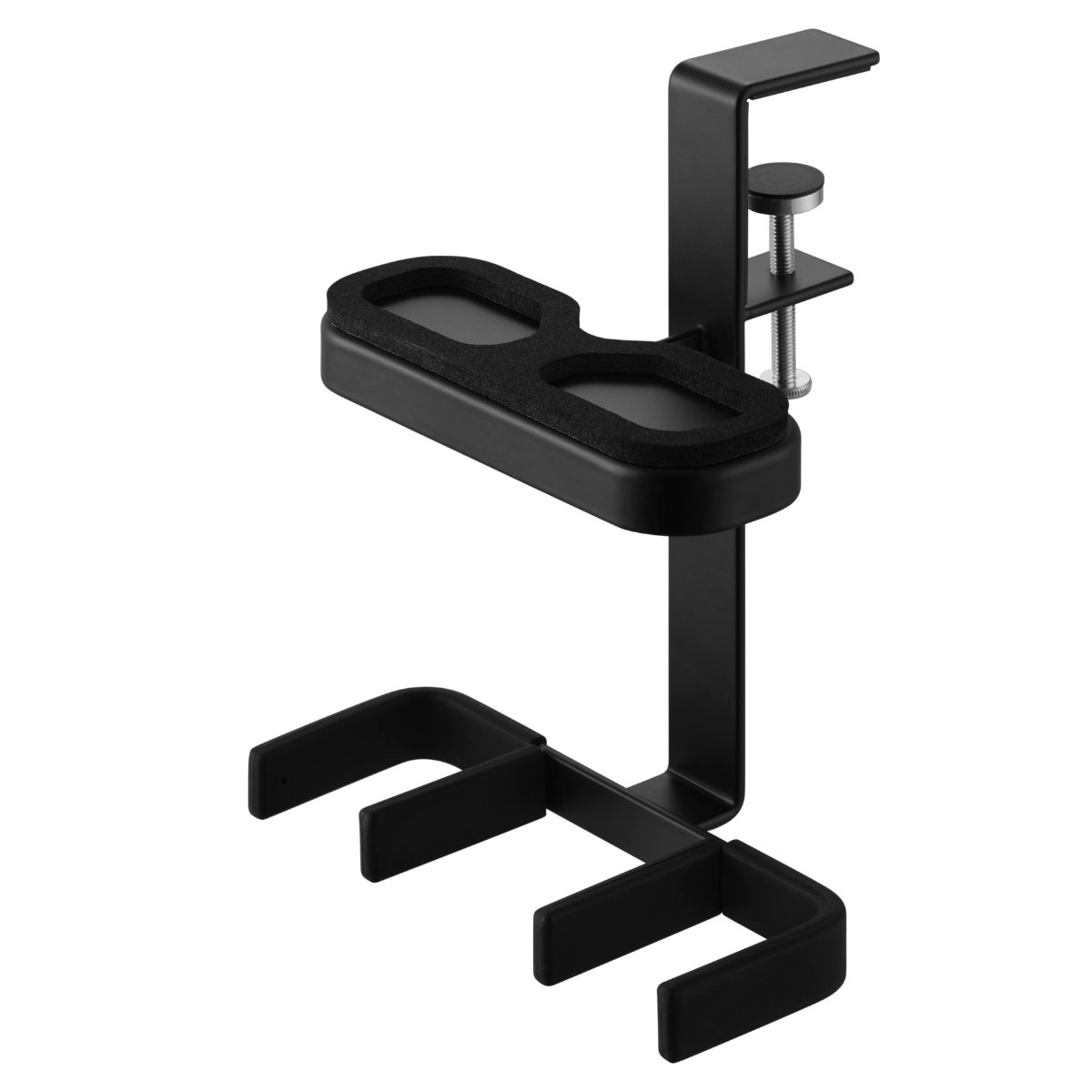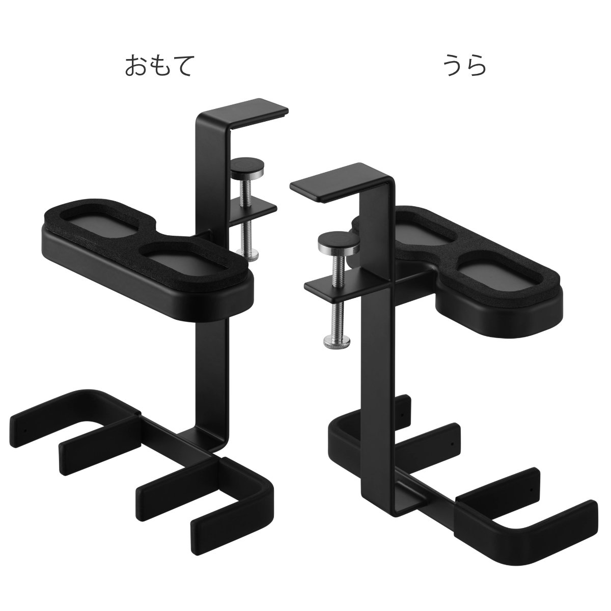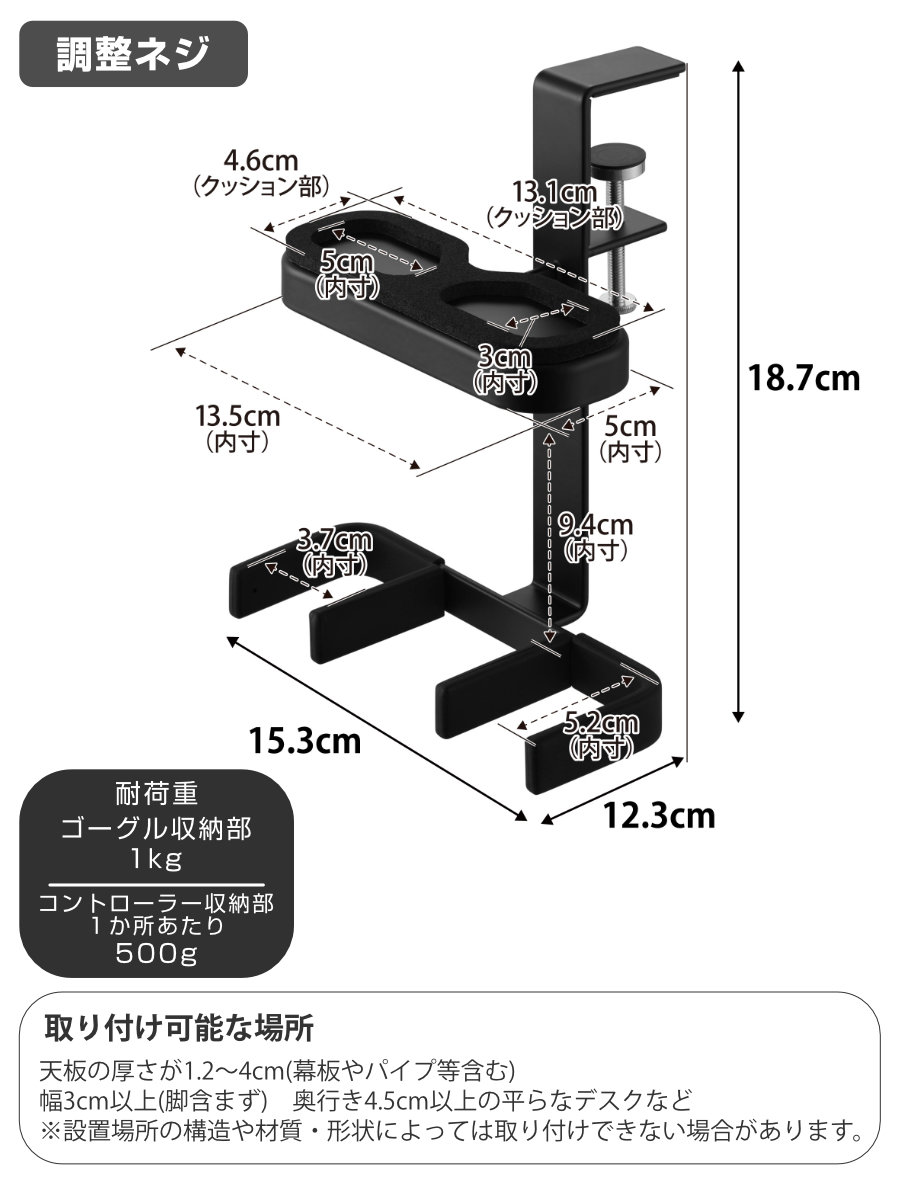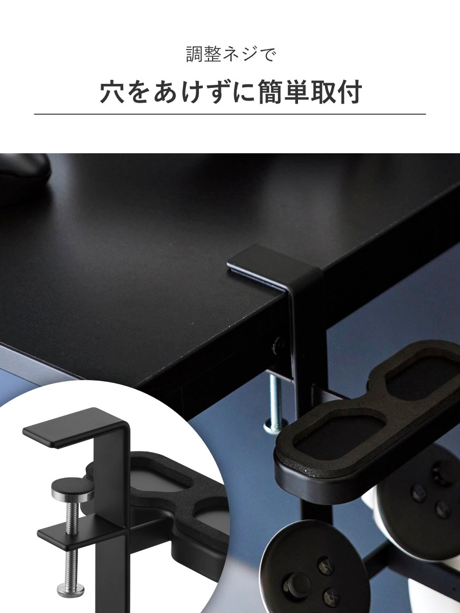 調整ネジ付きだから、デスクの天板に穴を開けずにしっかり固定できます。デスクの横や端に設置できるため、省スペースでVRゴーグルやコントローラーの収納に最適です。