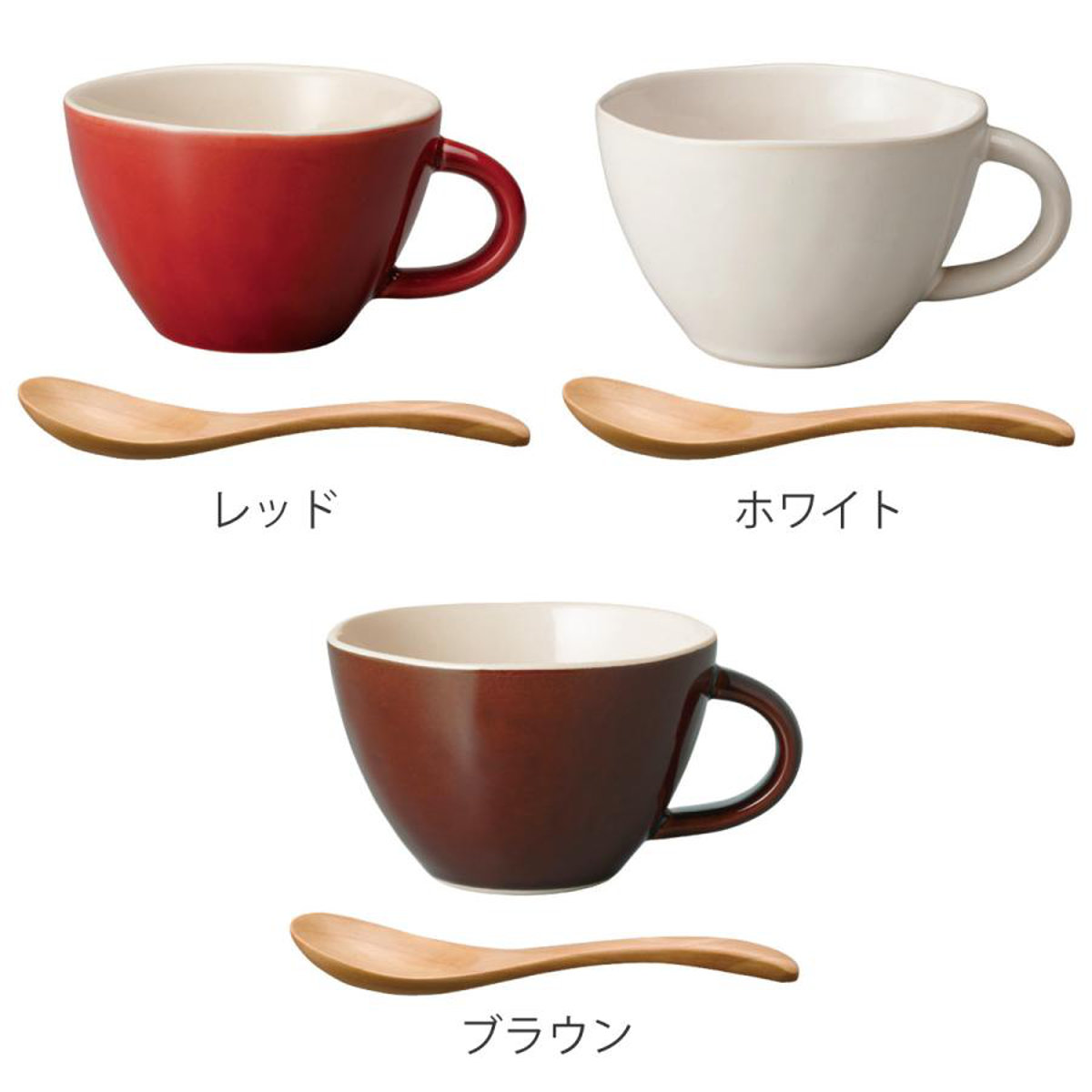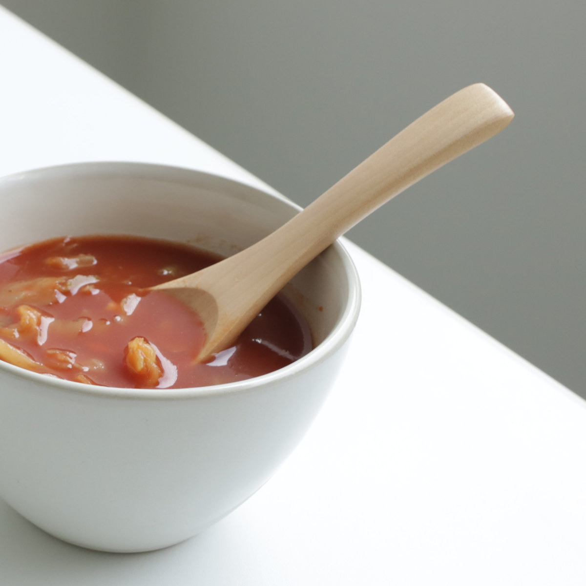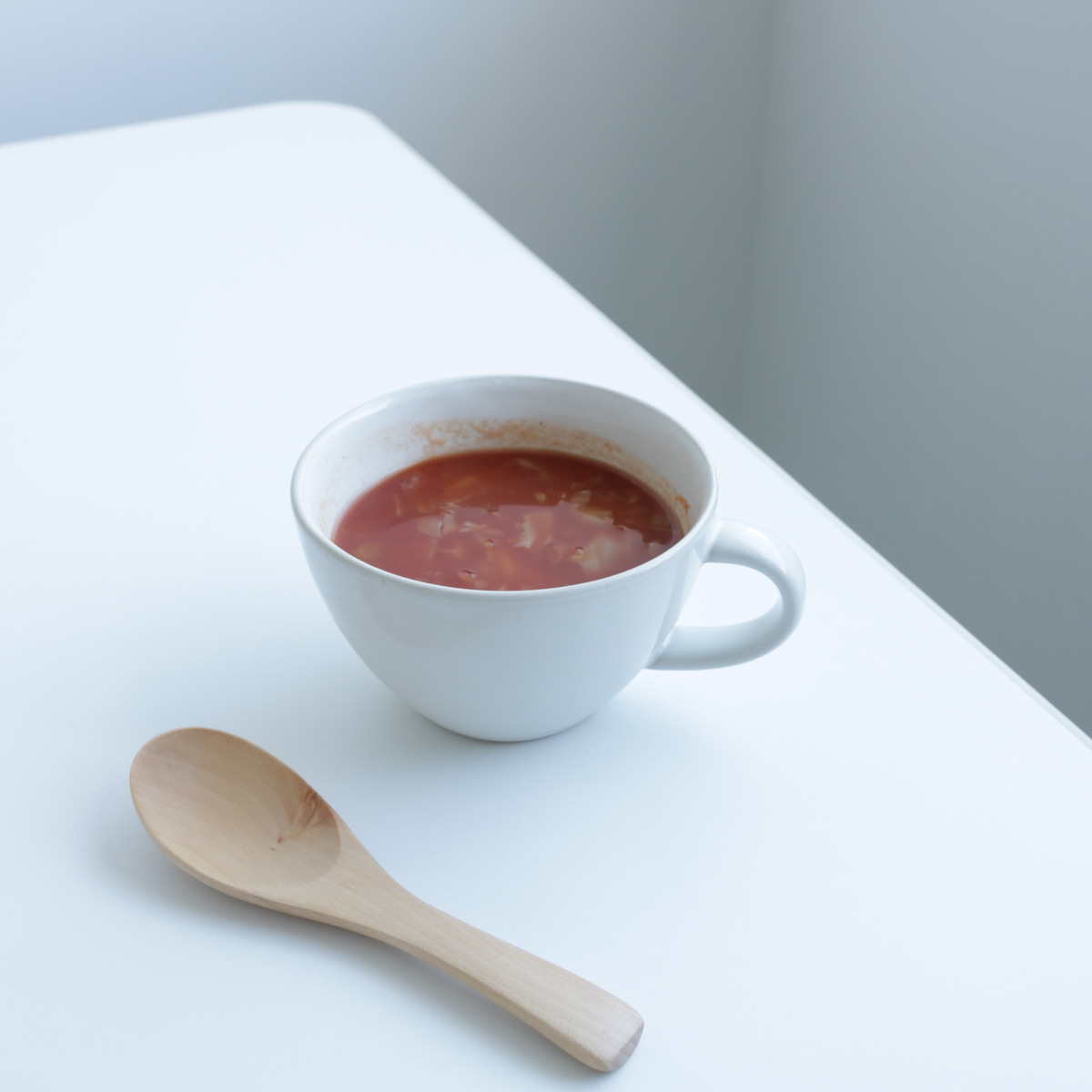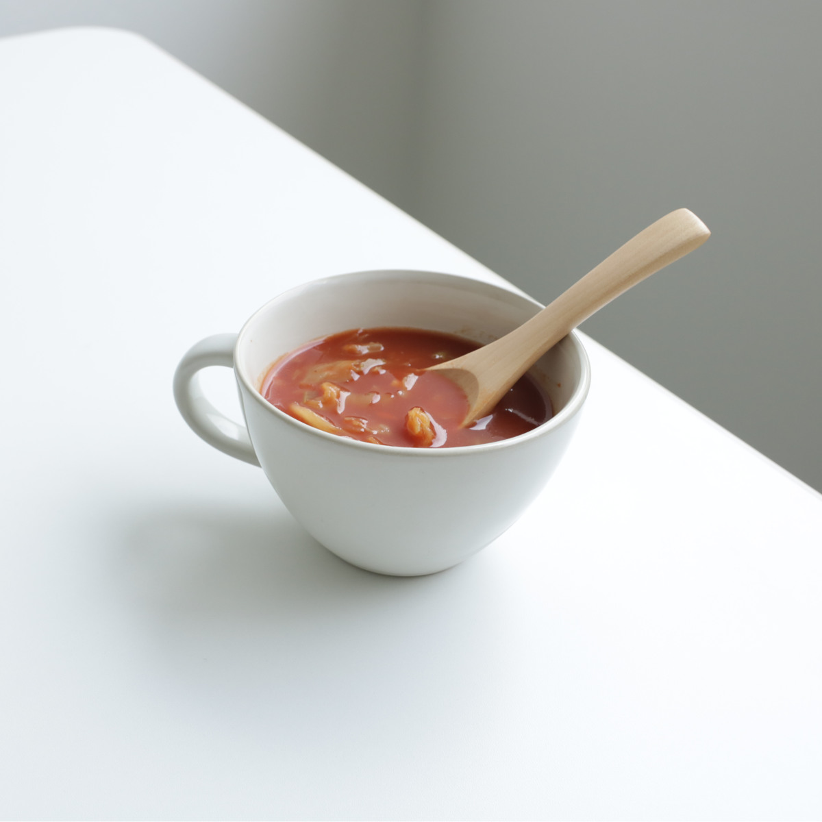 マグカップより少し大きめで、ゆっくりしたい時にちょうどいいサイズ感。取っ手は女性の指が約2本分入るぐらいの大きさです。口当たりがなめらかな木製スプーン付きなのでちょっとしたプレゼントにもおすすめです。