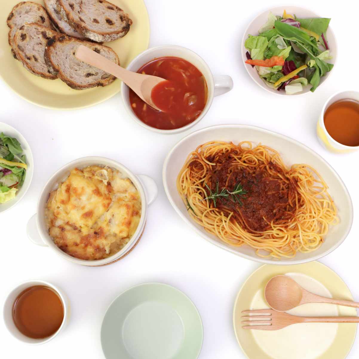 今回は、淡い色味の洋食器とほっくりのホワイトを組み合わせてみました。爽やかな雰囲気で、目でも楽しめるコーディネートが完成。こんな食卓でご飯を食べたら、より一層元気をチャージできそう。洋食器はもちろんですが、和食器にもしっくり馴染みます。