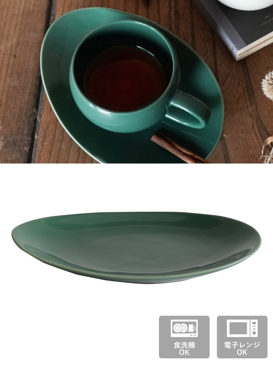 しずく型の余白部分にカップを置き、その横にちょっとしたお菓子を添えることができます。楕円型なので持ち運びしやすいです。