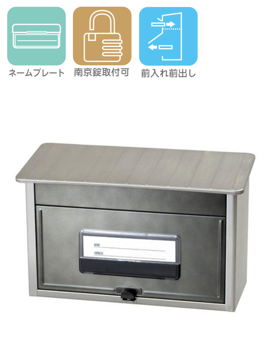 A4サイズや四折新聞などが投函可能です。メール便もらくらく投函できる広い投函口で、取出口も大きく開くので中が確認しやすく取り出しやすいです。表側に投函口と取出口がある前入れ前出し仕様になっているので、壁面にも設置ができます。