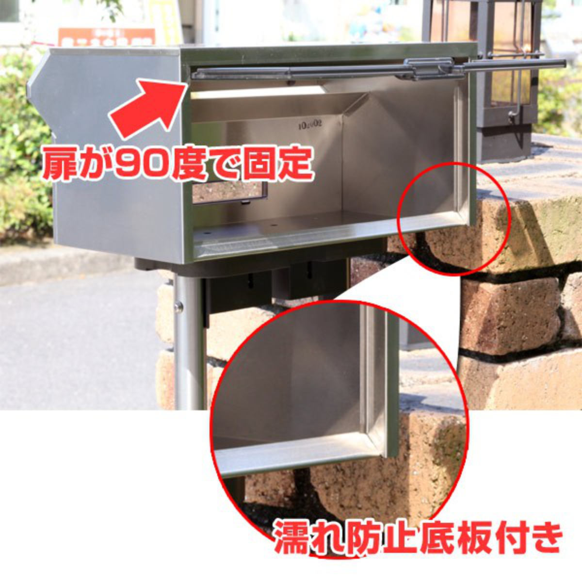 裏面の扉は90度開閉固定式になっているので、郵便物を取り出す際、両手が使えて便利です。濡れ防止底板が付いているので、郵便物の濡れを防止します。
