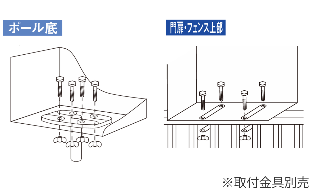 ※【門扉・フェンス側面】【門扉・フェンス上部】に取り付ける場合・・・別売取付金具が必要です。