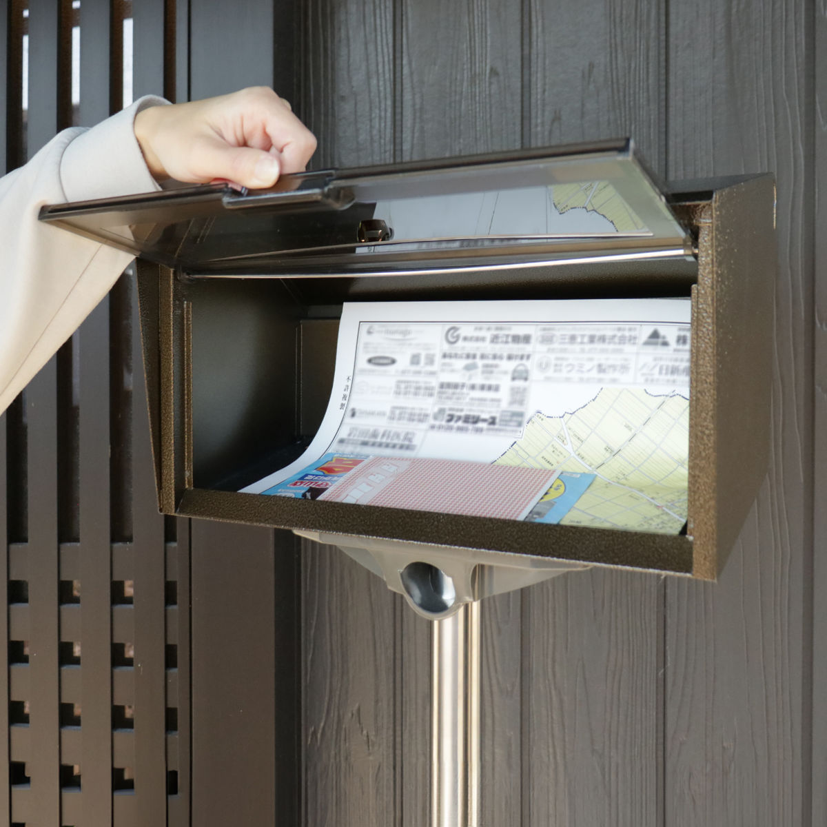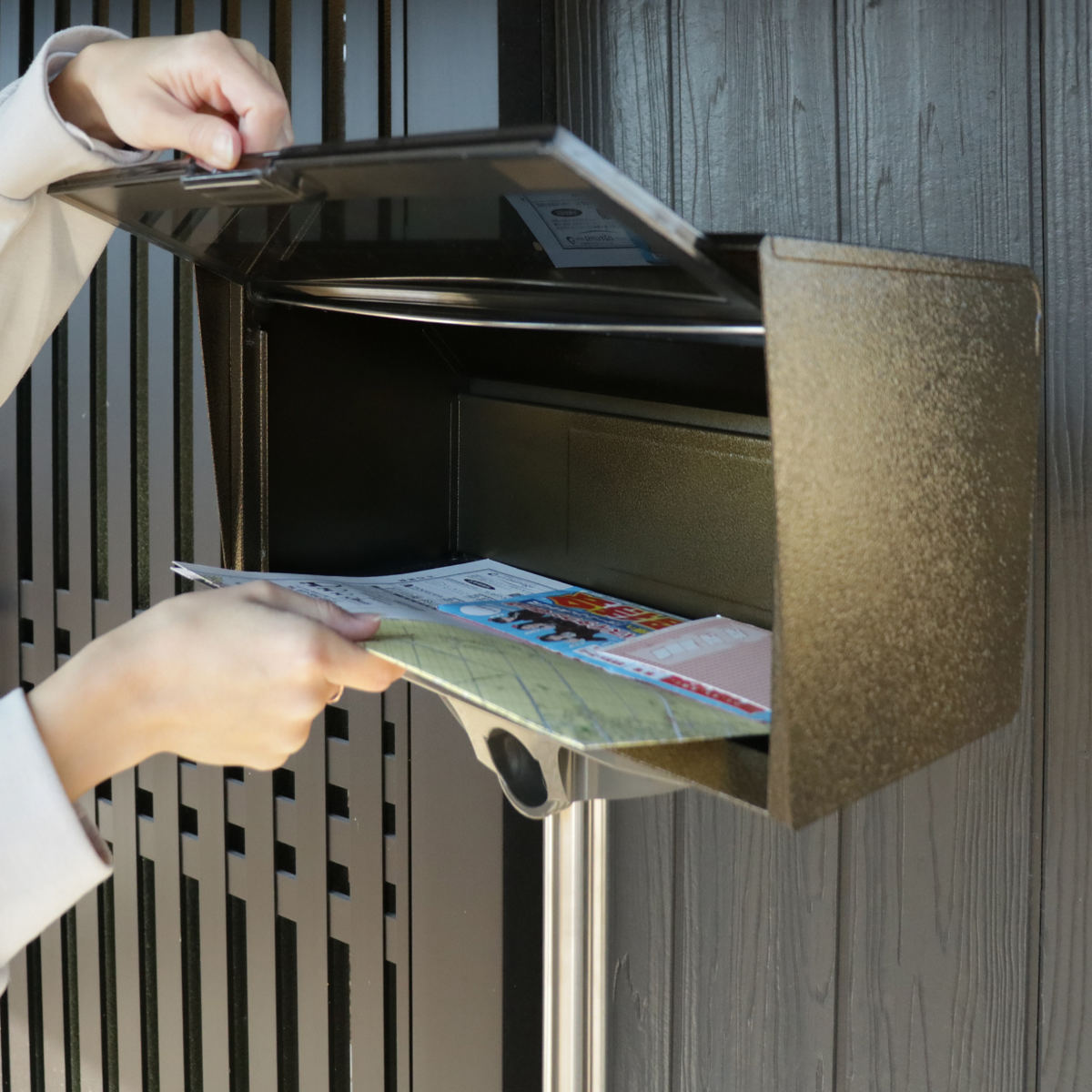 表側に投函口、裏側に取り出し口がある仕様になっています。取り出すときに、前に回りこまなくても郵便物が取り出せるので便利です。