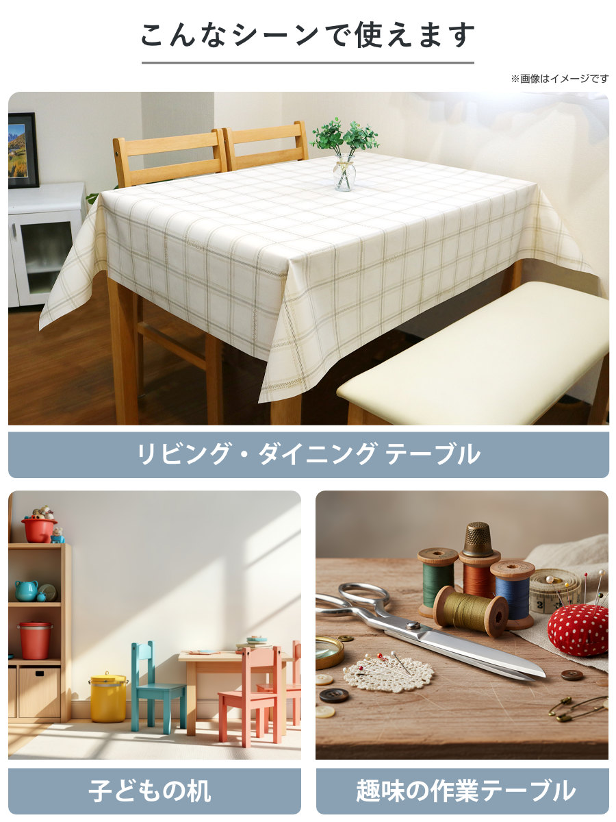 毎日使う食卓やダイニングテーブル、子どものお絵かき机、趣味の作業用テーブルなど、お好きなシーンでお使いいただけます。