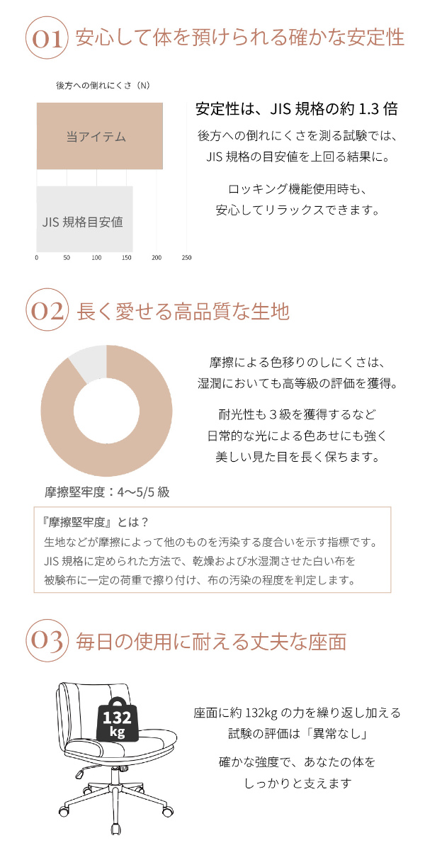 第三者機関にてJIS規格に準じた厳格な試験を実施し、定められた基準をクリア。末永く安心してお使いいただけます。