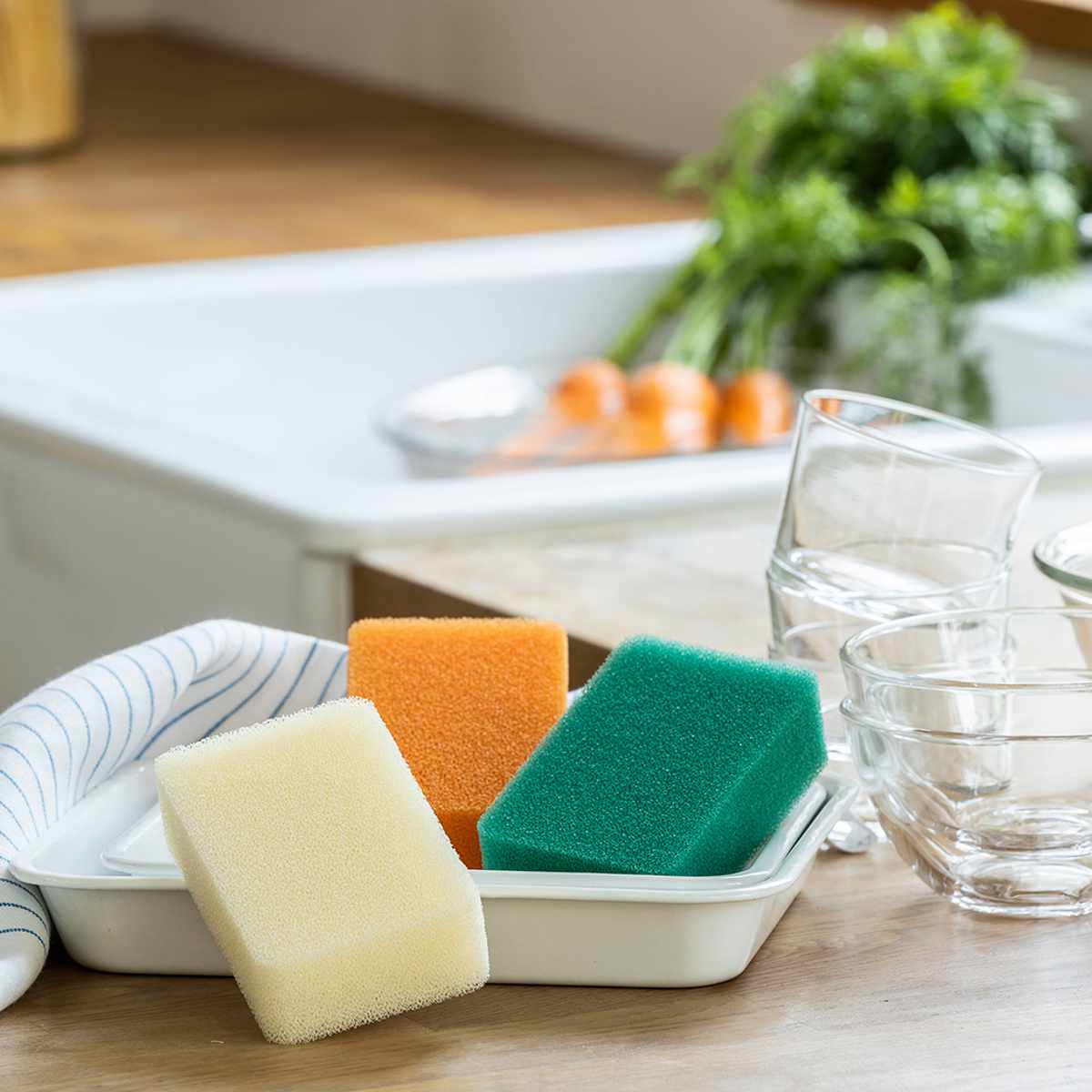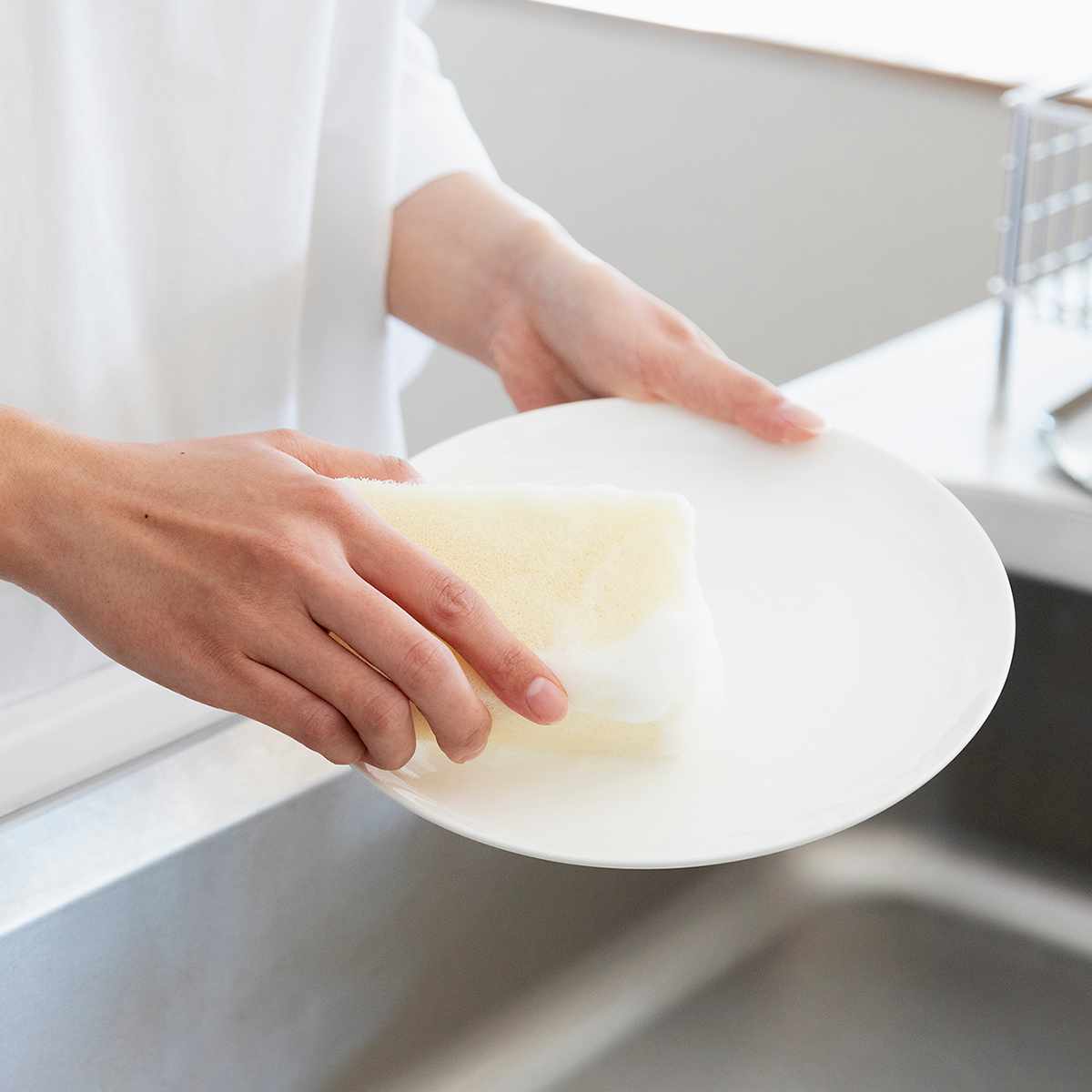 「シンプルさ」と「清潔さ」、「持ちやすい形」にこだわったスポンジです。少し厚めの角型で、しっかりとした握りごたえが特長です。ゴシゴシ洗いたいお鍋や汚れが強いものにおすすめです。
