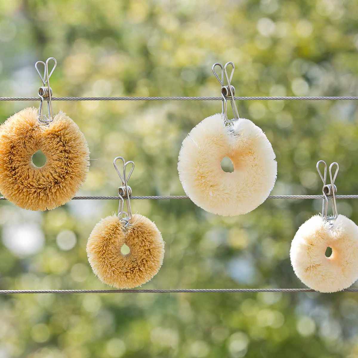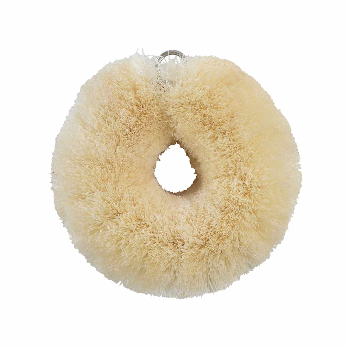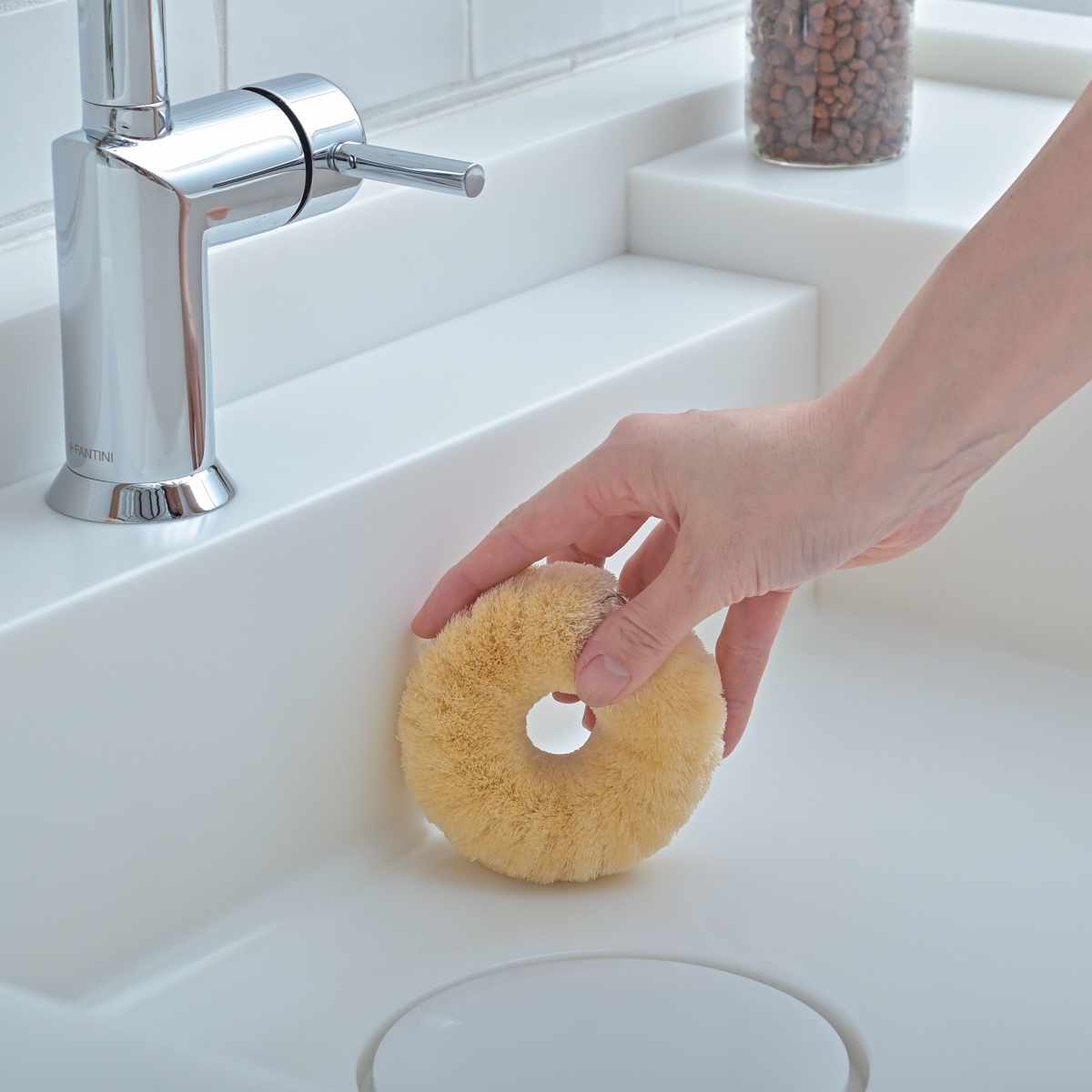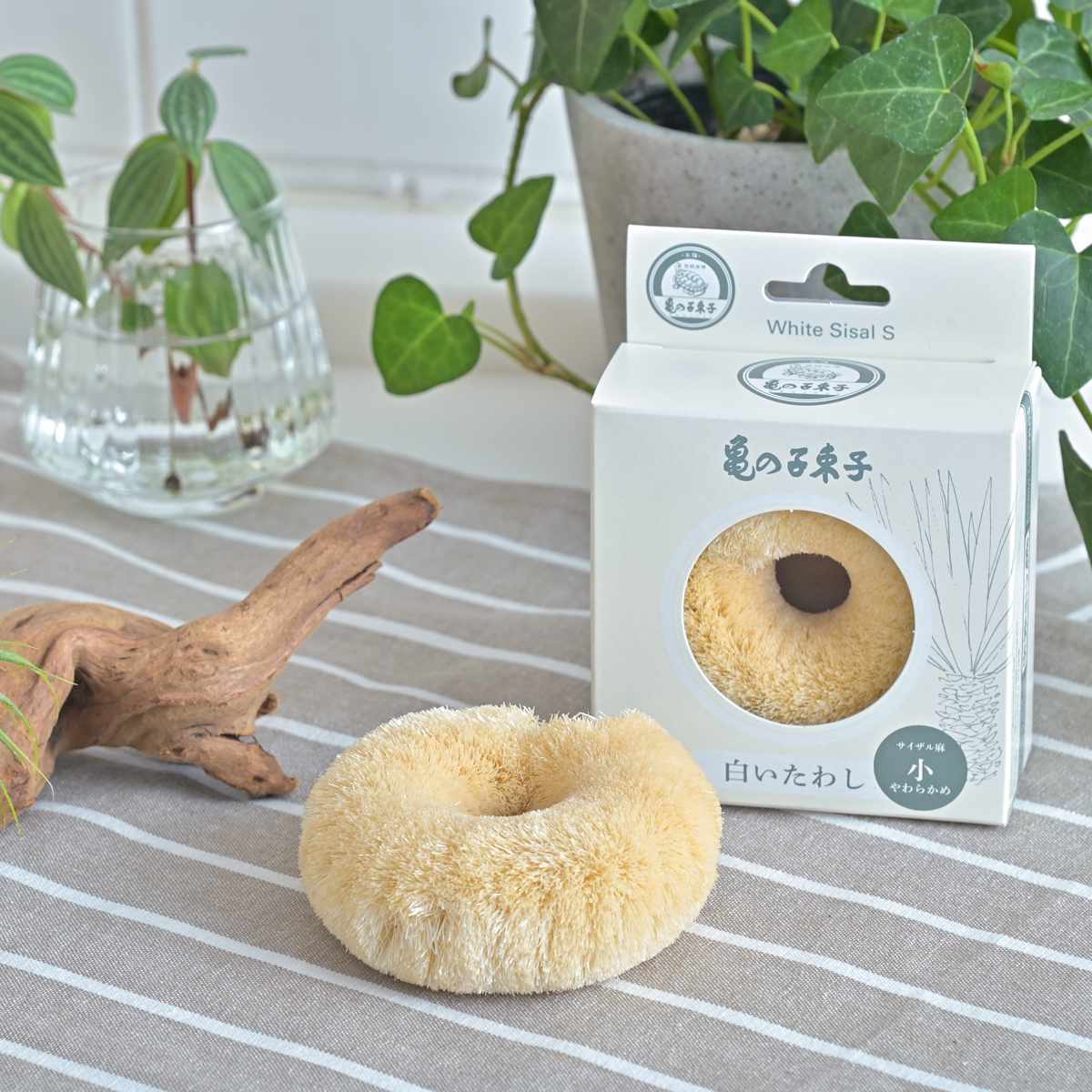 柔らかめのサイザル麻繊維を使用した、手に吸い付くような使い心地が特徴のたわしです。腰のある繊維が汚れを落とすため、少々の油汚れであれば洗剤を使う必要がなく、経済的にも環境にも優しいです。乾きやすいベーグル型と清潔感のある白色で、現代のキッチンにも自然になじむデザインです。