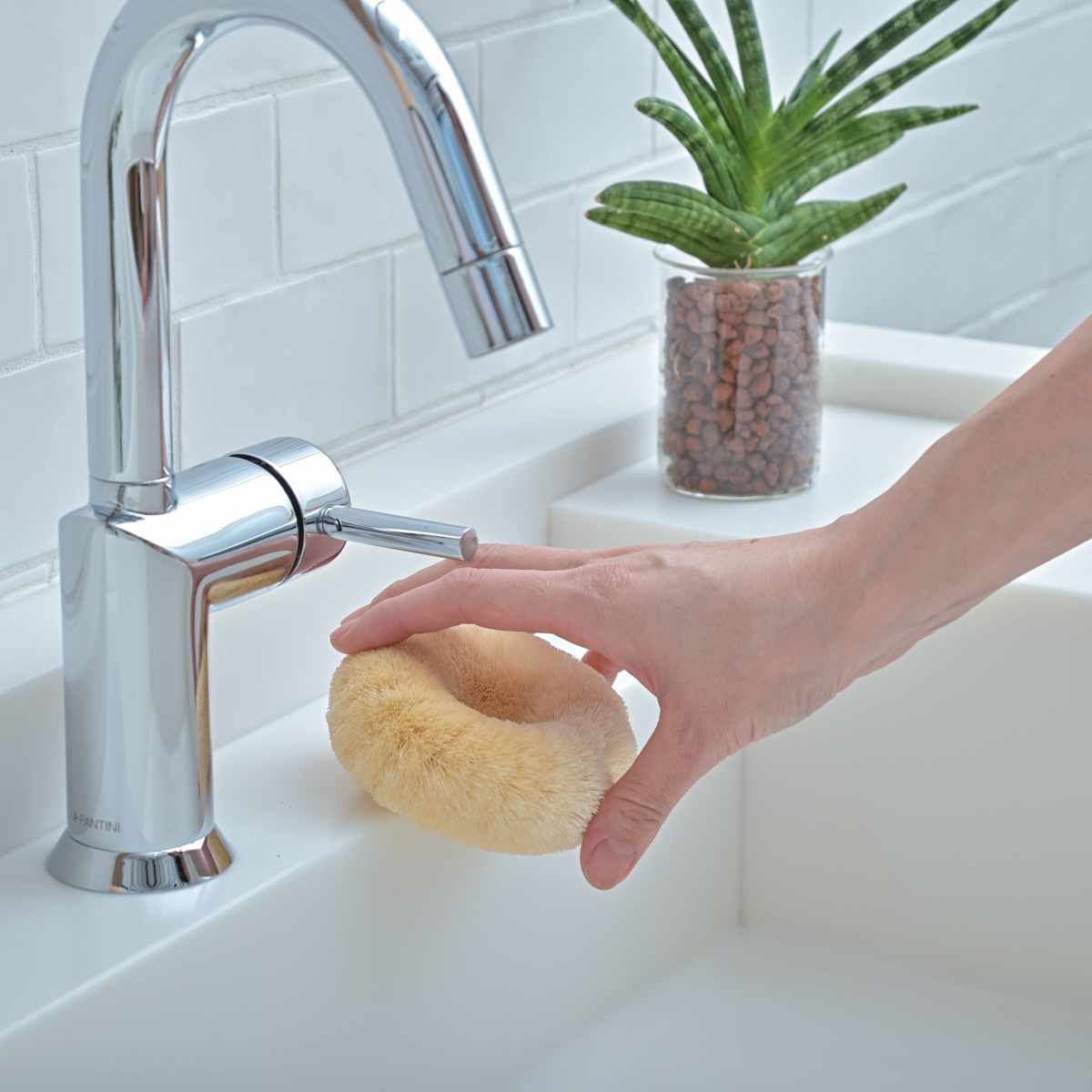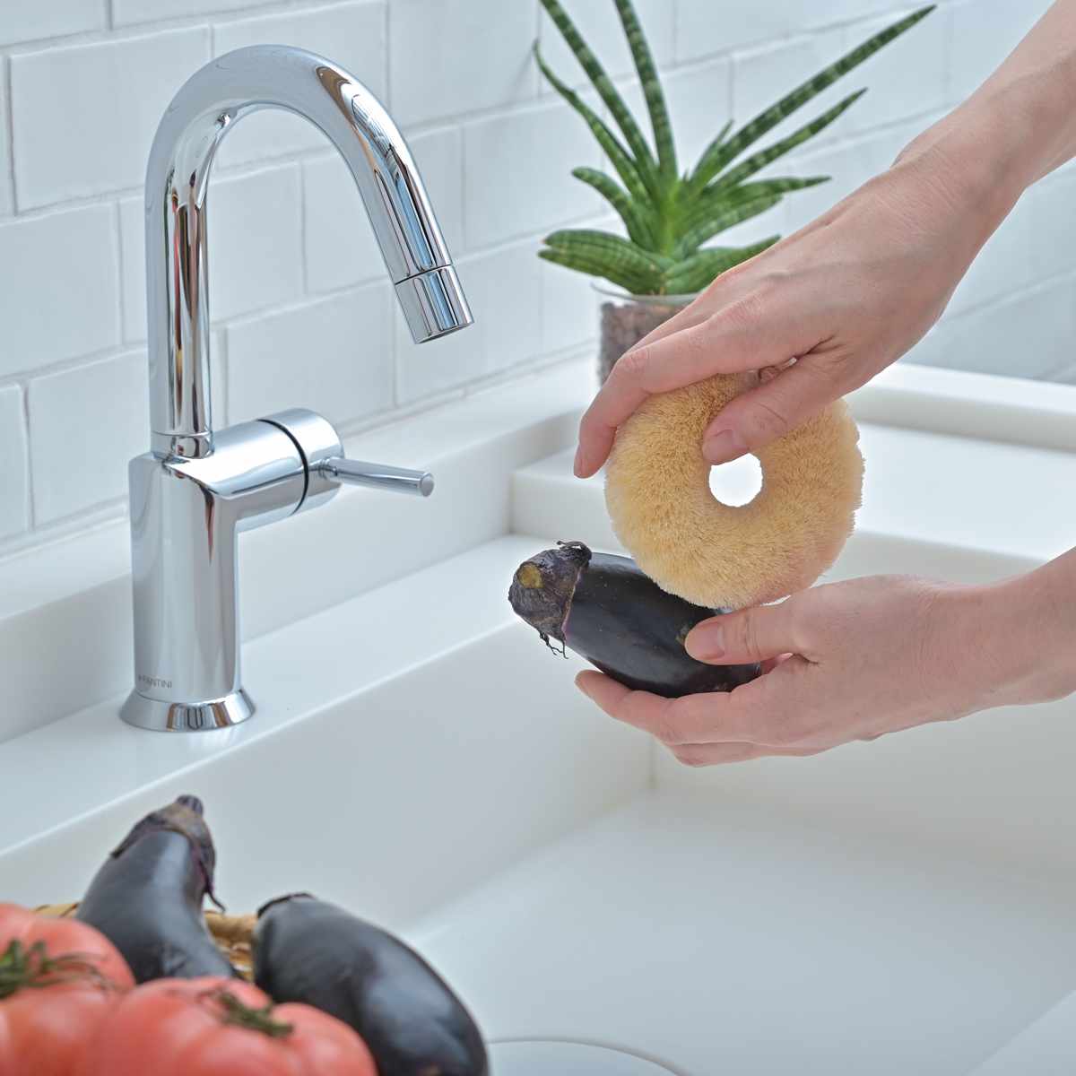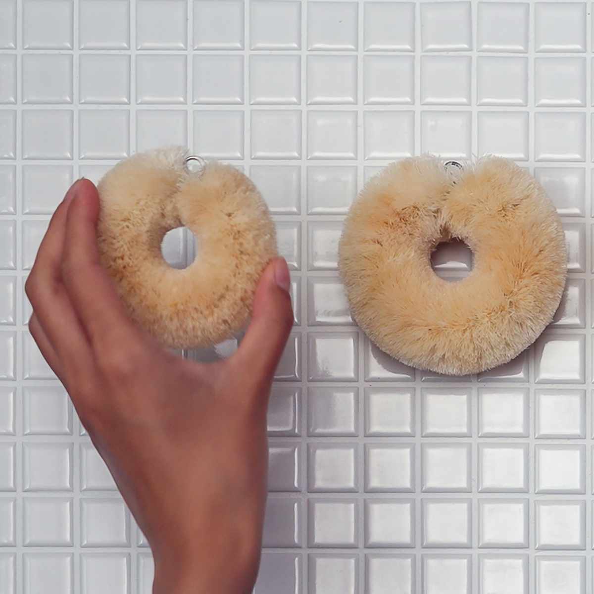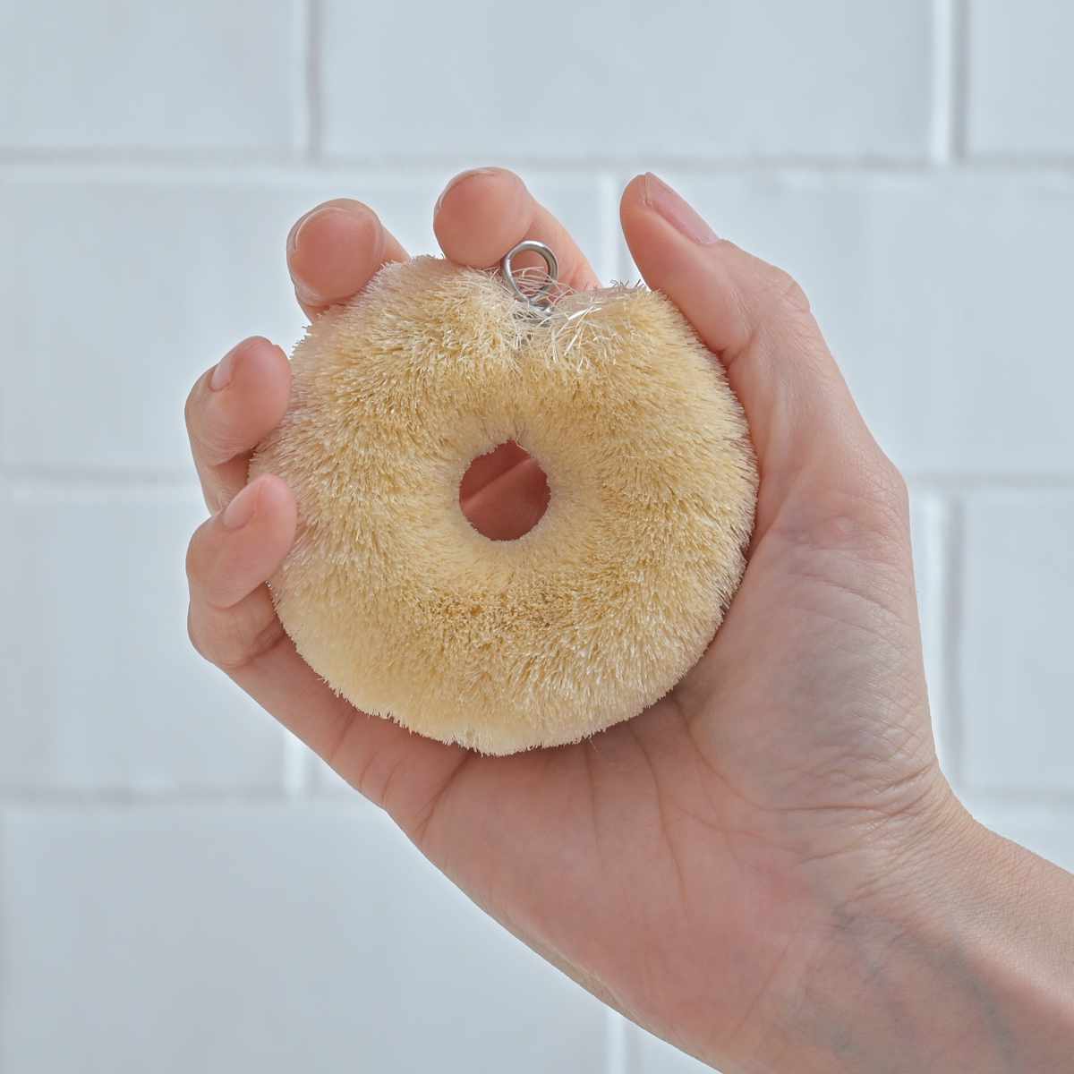 柔らかめのサイザル麻繊維を使用した、手に吸い付くような使い心地が特徴のたわしです。腰のある繊維が汚れを落とすため、少々の油汚れであれば洗剤を使う必要がなく、経済的にも環境にも優しいです。乾きやすいベーグル型と清潔感のある白色で、現代のキッチンにも自然になじむデザインです。