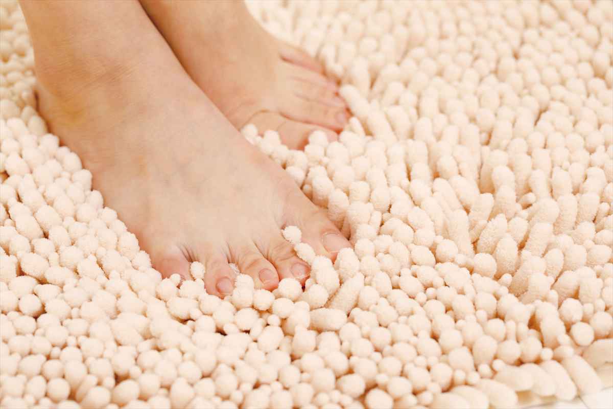 足の土踏まずや指の間までモール糸が入り込み、隅々まで水分を吸い取ります。吸収された水分は、毛細管現象で拡散されて蒸発していきます。吸水速乾に優れているので、マットの表面はいつもサラサラの肌触りです。