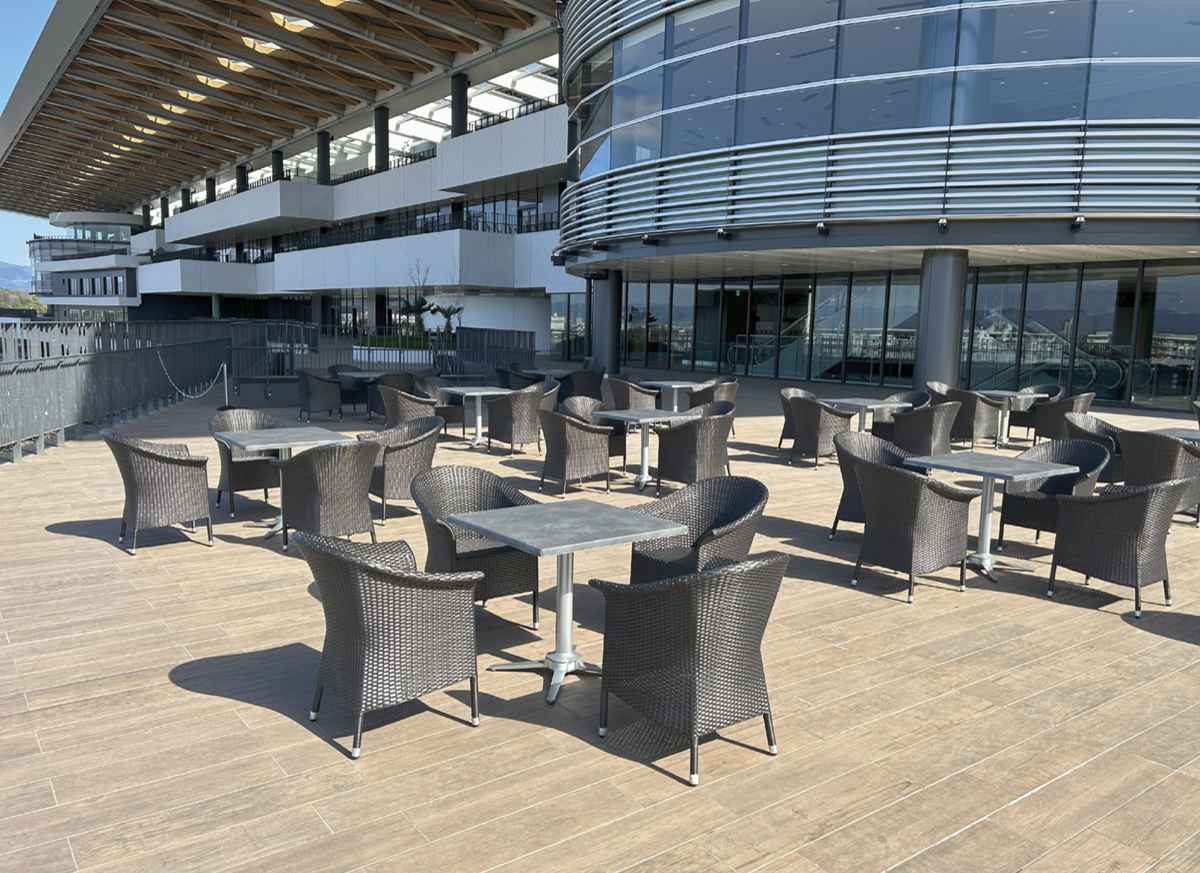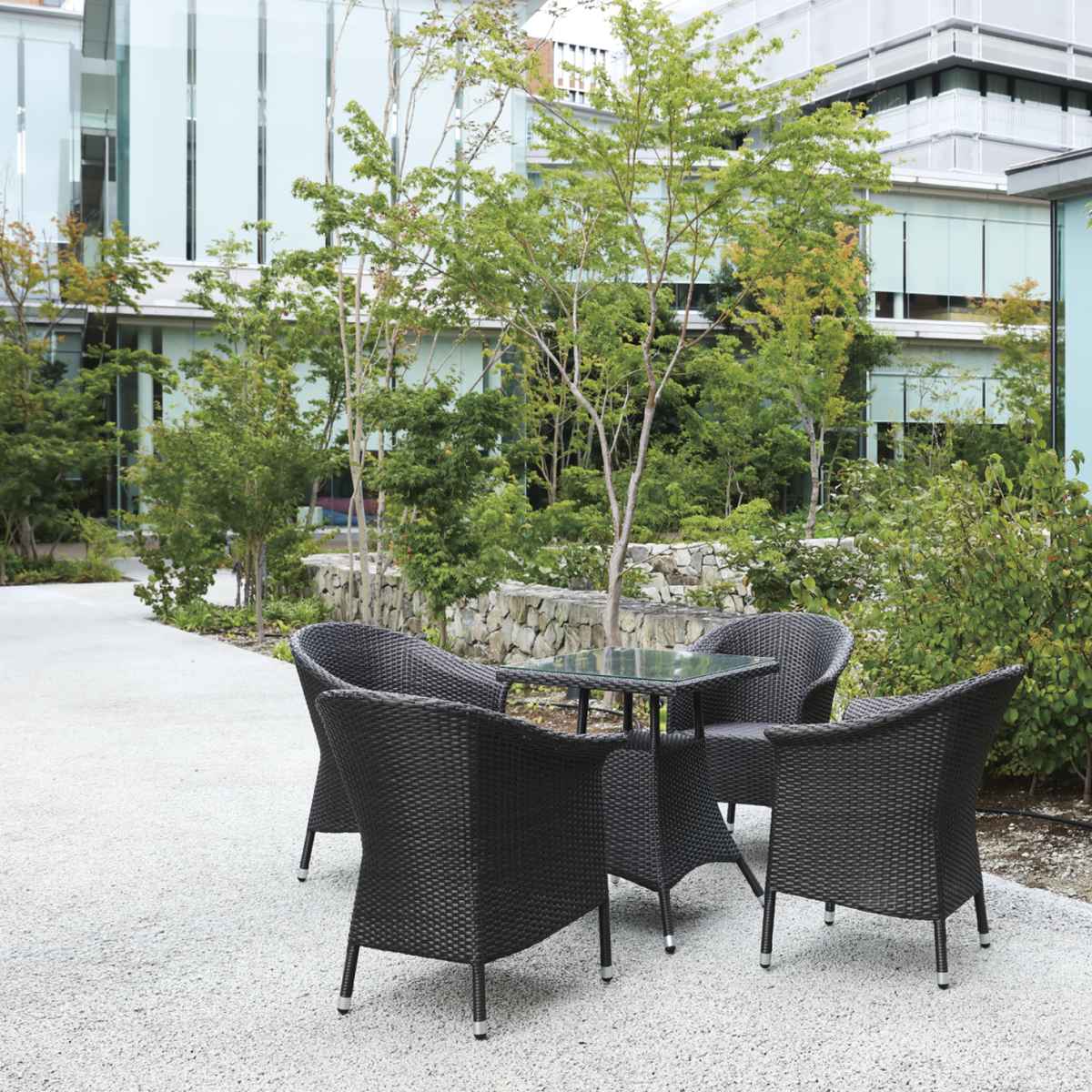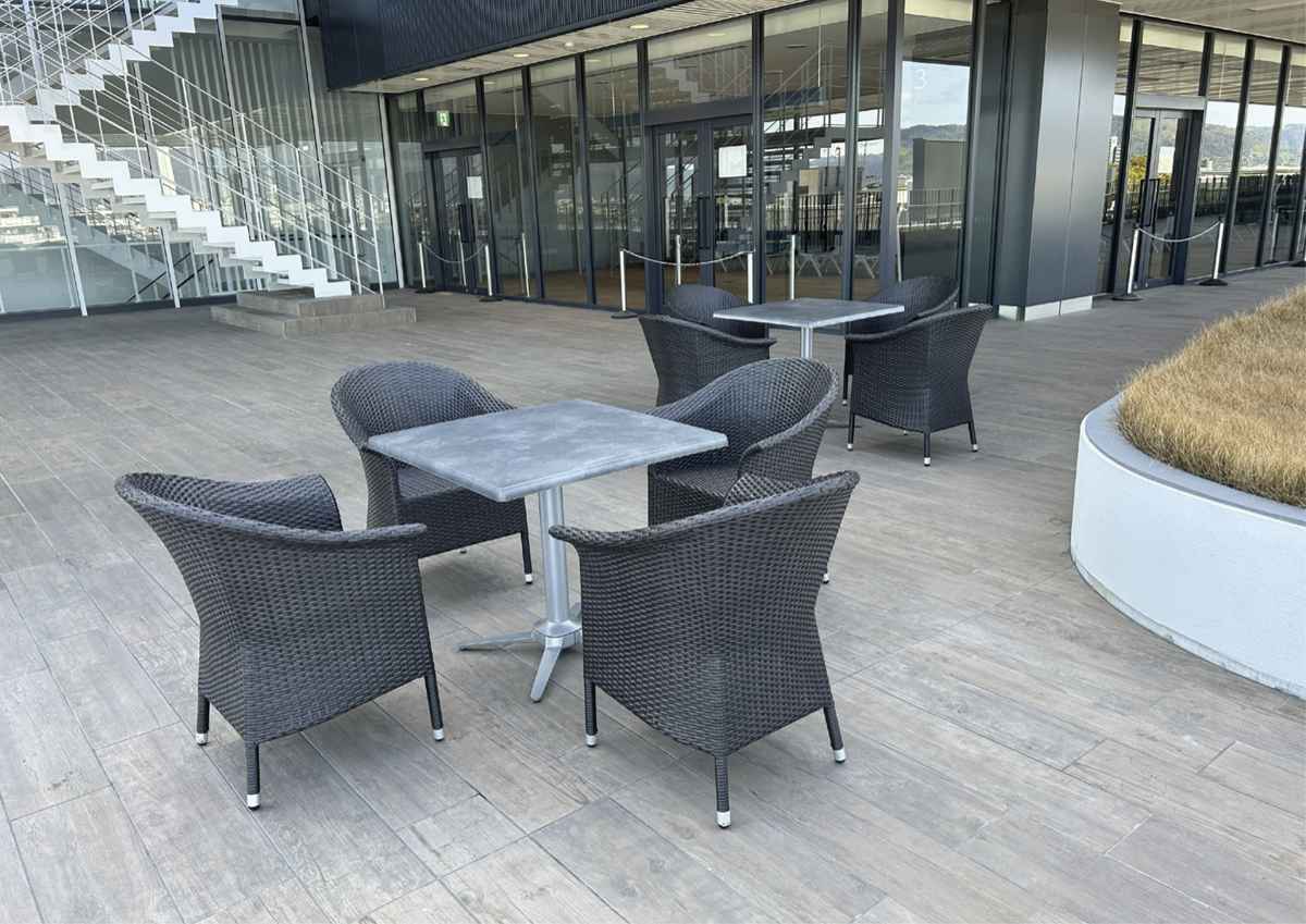 まるでリゾートテラスのような雰囲気のあるラタン調チェアーです。置くだけで高級感のある空間を演出します。商業施設、大学、飲食店のテラスなど、さまざまな場所でお使いいただけます。