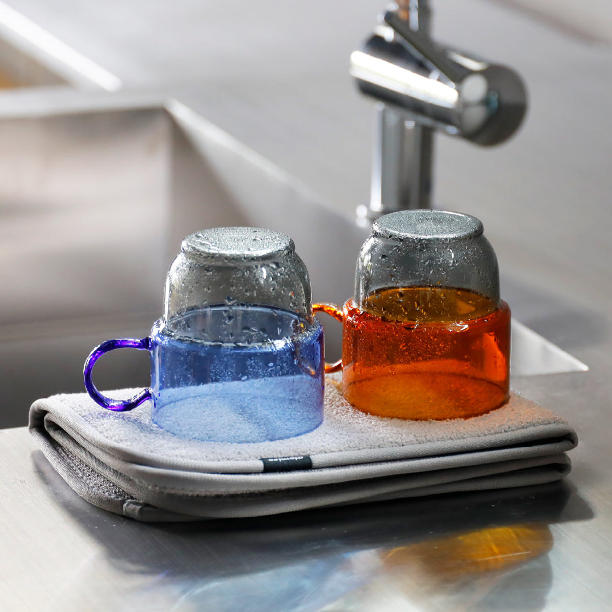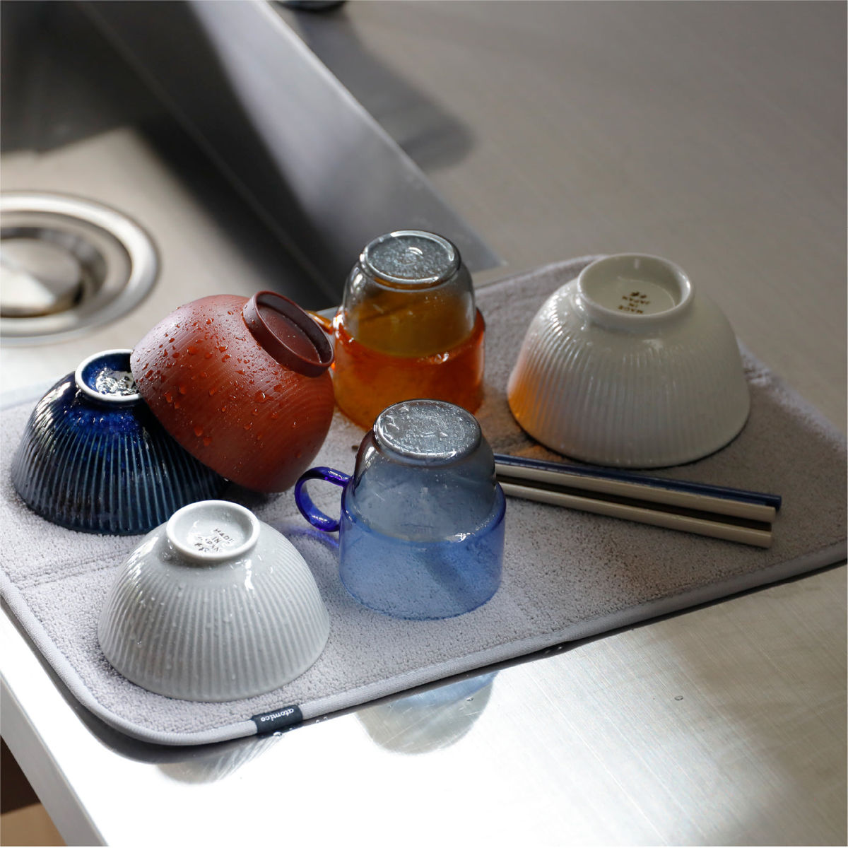 ふんわり柔らかい高機能マイクロファイバーで素早く吸水する水切りマットです。やわらかい質感でグラスやお皿を傷つけにくいので洗った食器をやさしく受け止めてくれます。