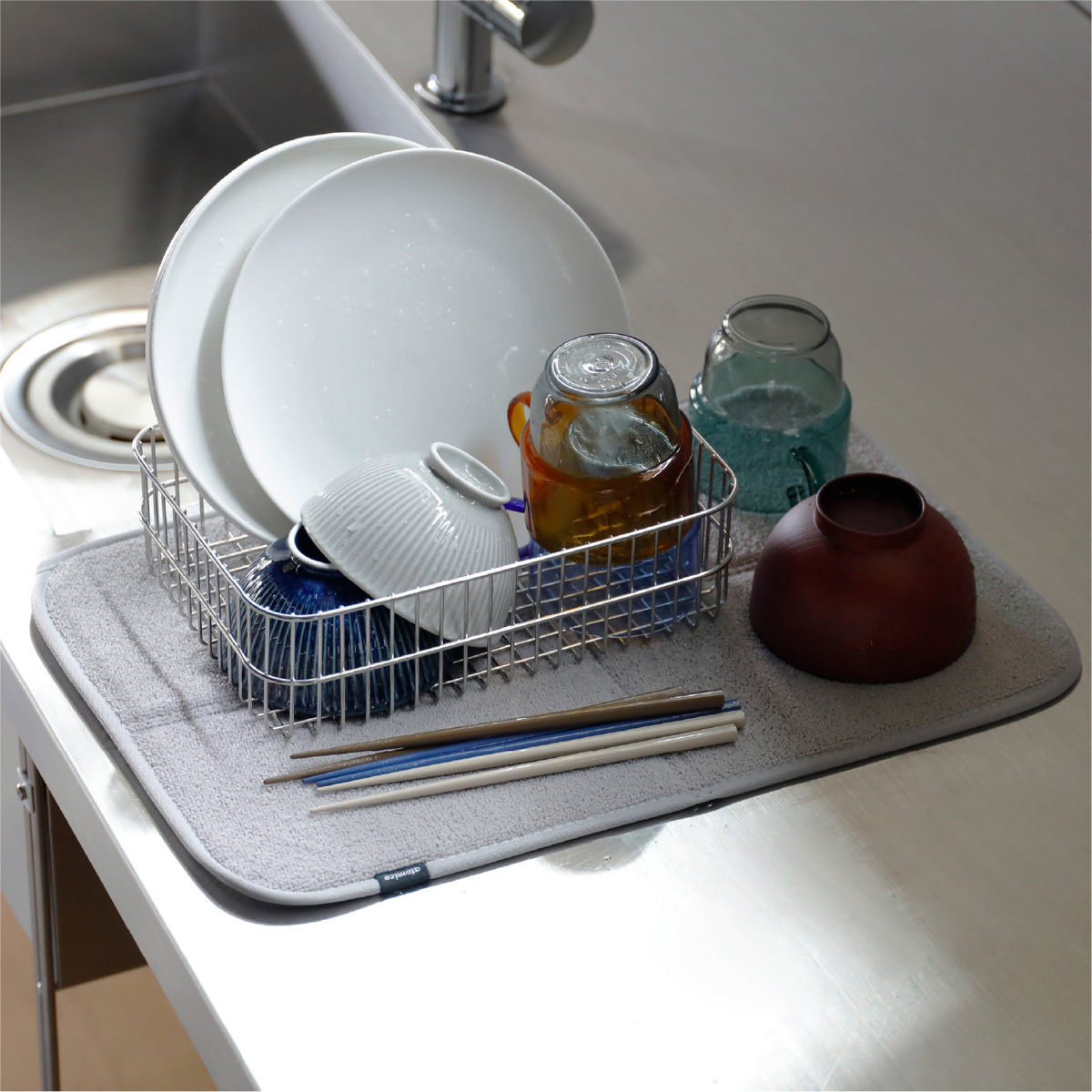 食器を直接置くだけでなく、水切りラックの下に敷いて使うのもおすすめです。ラックから垂れる水もしっかり吸収してくれるので、キッチン台が濡れるのを防ぎ、清潔に保てます。