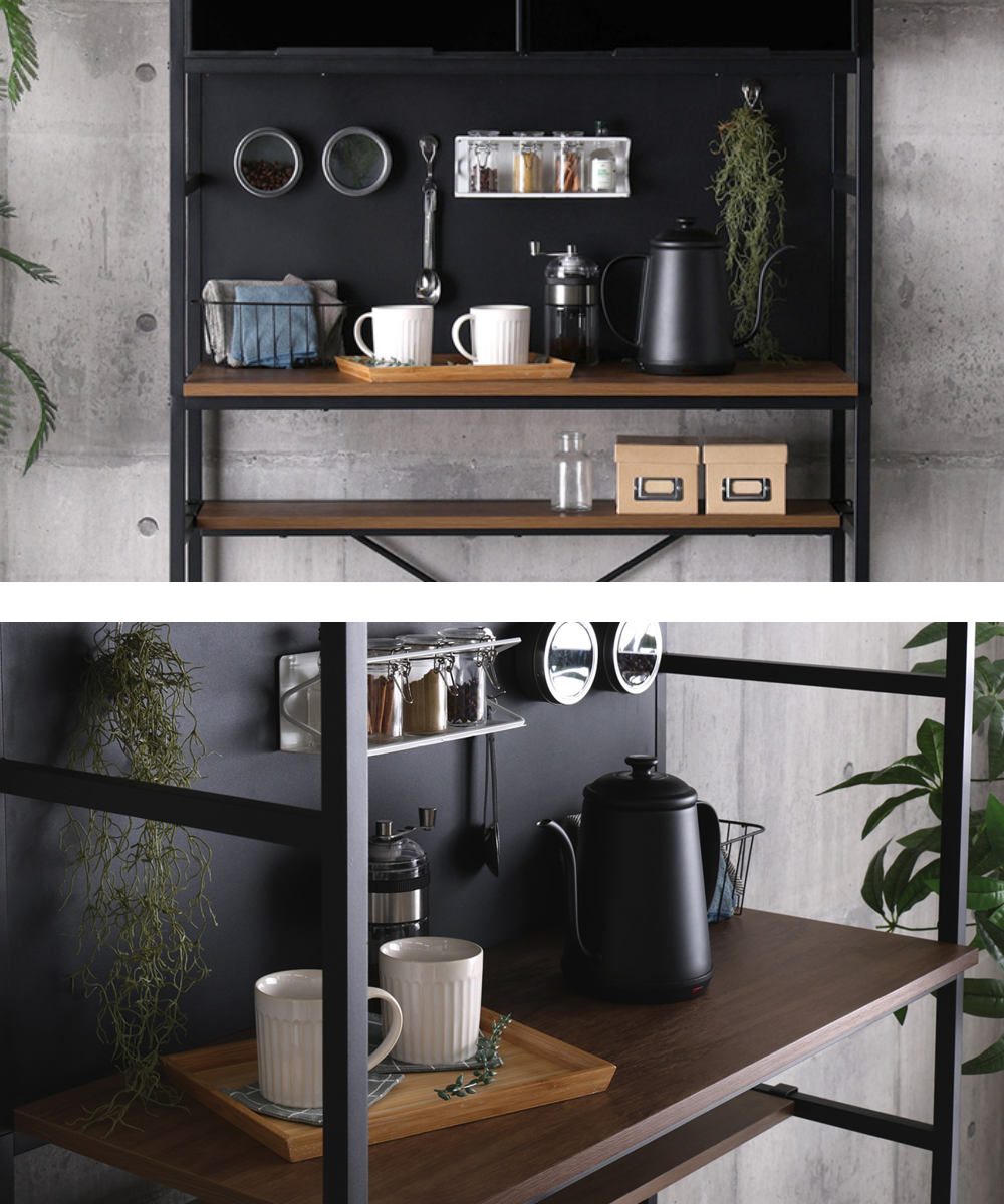 無駄のない設計で、キッチン小物をスマートに収納できます。ガラス扉、可動棚に加えて背面がマグネット対応になっています。