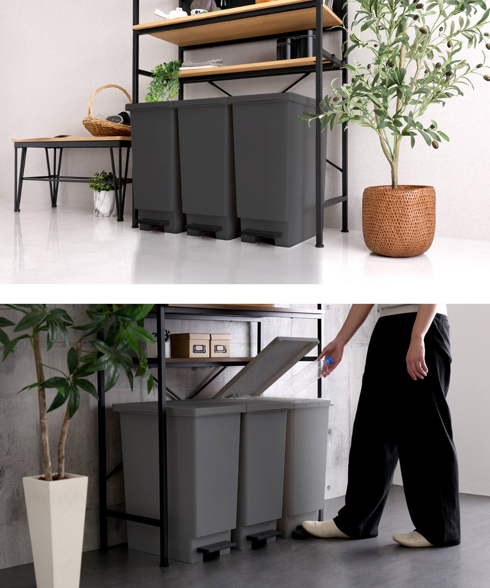 45Lのスリムタイプのゴミ箱を3つ配置できます。フタの開閉や袋の交換がしやすく、ワゴンや日用品の収納など、使い方は自在です。