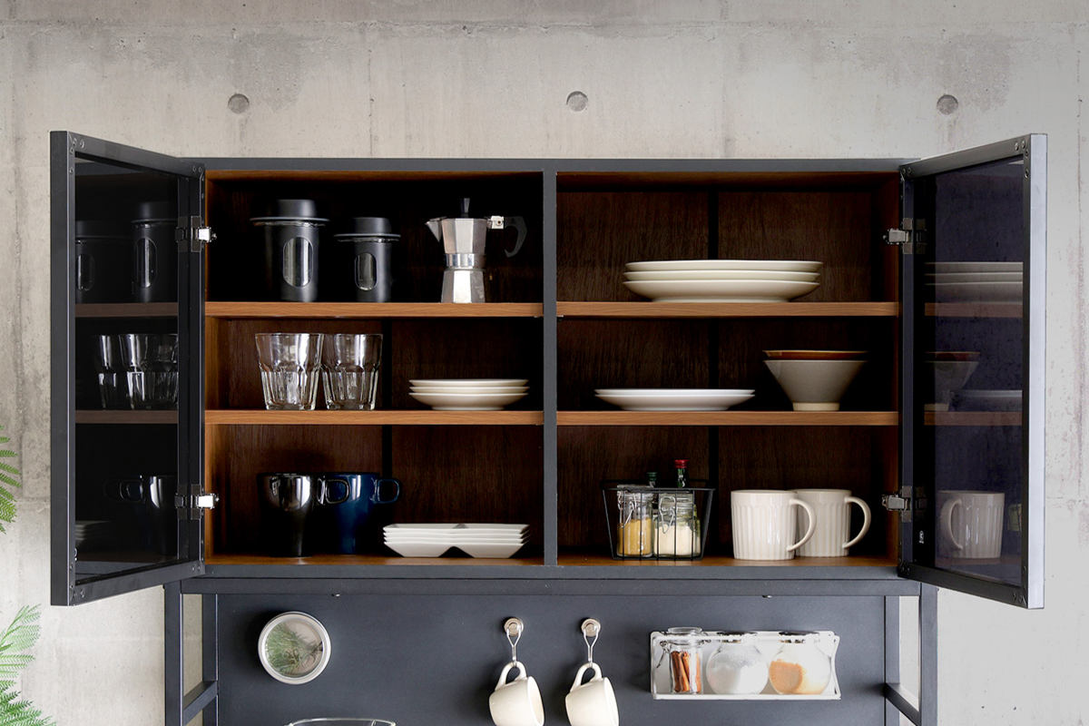 上段には、奥行きのあるガラス扉収納を配置しています。4枚の棚板は6段階に調整でき、食器や背の高い調理器具まですっきり収納できます。